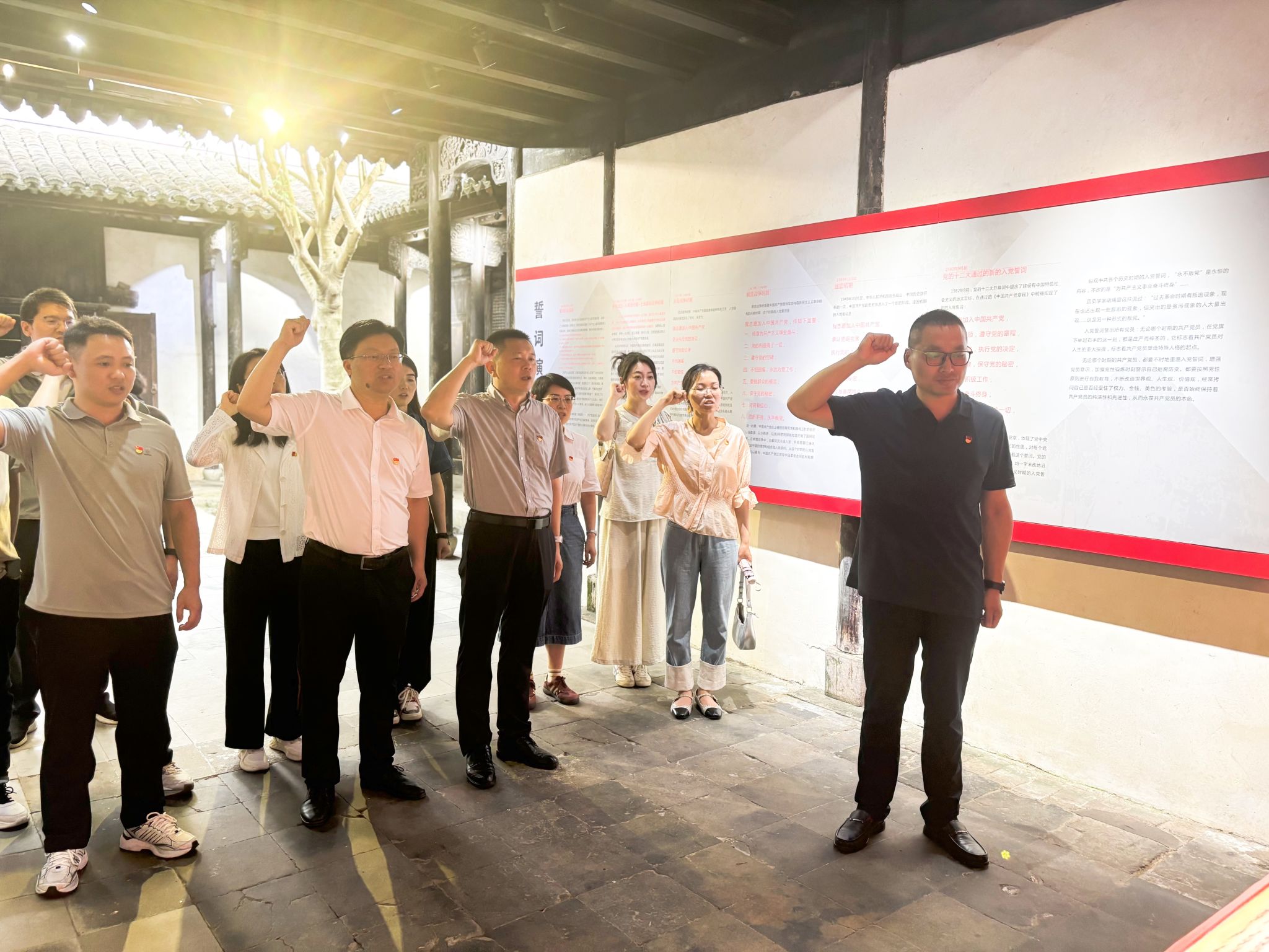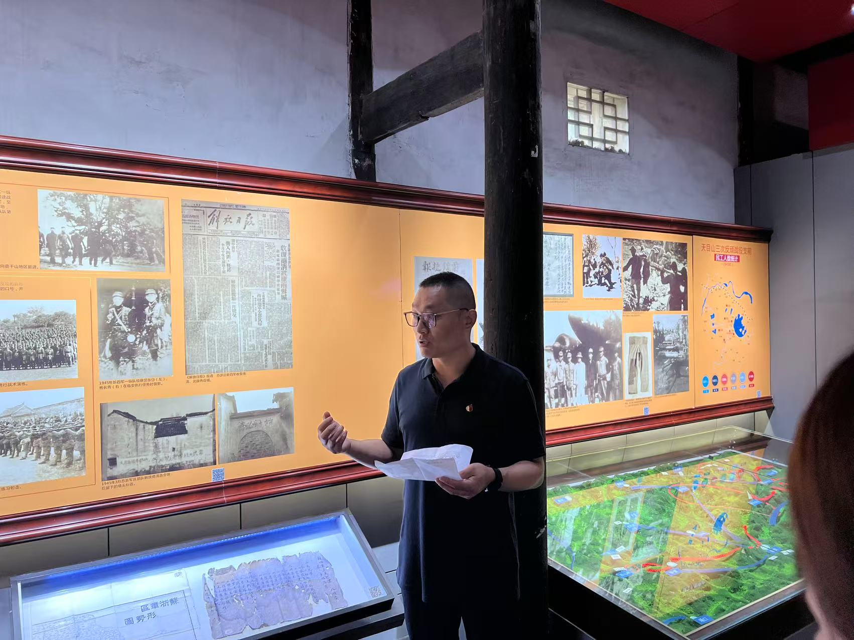 深入贯彻落实中央八项规定精神,在红色场馆中学纪律规矩。主题党日活动的第二站是新四军苏浙军区革命纪念馆。教师党员在参观中通过粟裕将军作战笔记、军用地图及《新四军对日驻军通牒》等文物,深入体悟新四军“铁的纪律、铁的作风、铁的信念”精神内核。展柜中陈列的新四军“三大纪律八项要求十项注意”与中央八项规定精神形成历史呼应,彰显党的作风建设的一脉相承。在党旗前,教师党员重温入党誓词。