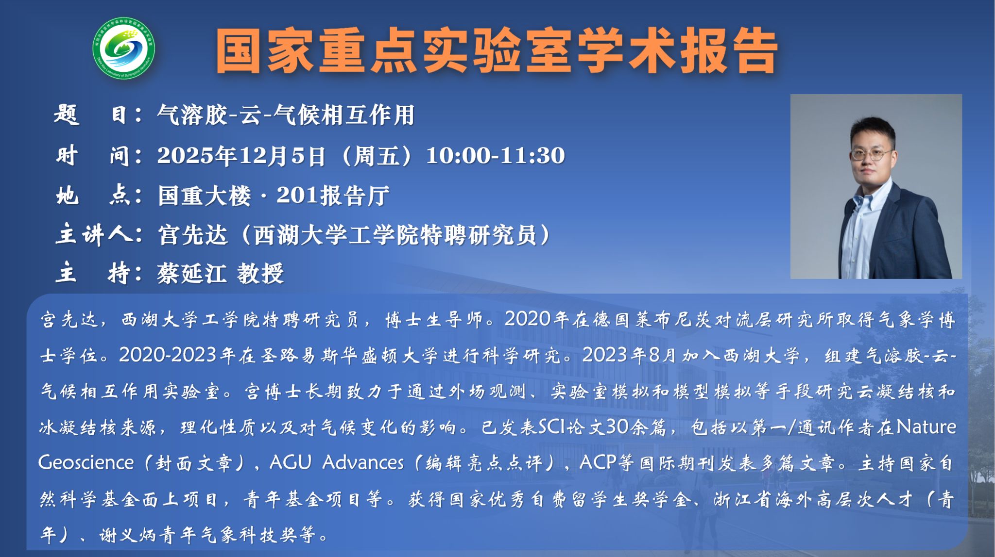宫先达,西湖大学工学院特聘研究员,博士生导师。2020年在德国莱布尼茨对流层研究所取得气象学博士学位。2020-2023年在圣路易斯华盛顿大学进行云开体彩下载官网。2023年8月加入西湖大学,组建气溶胶-云-气候相互作用实验室。宫博士长期致力于通过外场观测、实验室模拟和模型模拟等手段研究云凝结核和冰凝结核来源,理化性质以及对气候变化的影响。已发表SCI论文30余篇,包括以第一/通讯作者在Nature Geoscience(封面文章), AGU Advances(编辑亮点点评), Atmospheric Chemistry and Physics等国际期刊发表多篇文章。主持国家自然科学基金面上项目,青年基金项目等。获得国家优秀自费留学生奖学金、浙江省海外高层次人才(青年)、谢义炳青年气象科技奖等。
