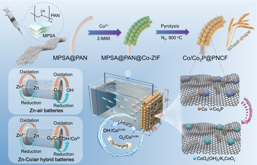 近日,化材学院胡勇教授、颜磊博士等人在国际顶尖期刊《Advanced Energy Materials》(中科院1区Top,IF=24.4)在线发表题为《自重构Co/Co2P异质结构提高碱性Zn-Co/air杂化电池的效率和耐久性》(Enhancing Efficiency and Durability of Alkaline Zn-Co/Air Hybrid Batteries with Self-Reconstructed Co/Co2P Heterojunctions)的研究论文。该工作成功合成了一种类似小麦状的Co/Co2P@PNCF材料,并首次将其作为可充电Zn-Co/air杂化电池的高效自支撑阴极,实现了杂化电池优异的性能输出。论文通讯作者为化材学院胡勇教授,共同通讯作者为颜磊博士。