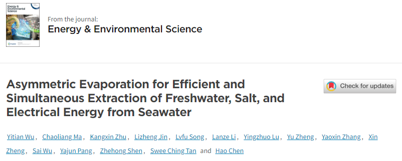 10月28日,化材学院林业工程学科沈哲红教授研究团队在能源与环境领域国际顶尖期刊《Energy & Environmental Science》(中科院1区Top,IF=32.4)在线发表题为“Asymmetric Evaporation for Efficient and Simultaneous Extraction of Freshwater, Salt, and Electrical Energy from Seawater”(非对称蒸发用于从海水中同时高效提取淡水、盐和电能)的研究论文。第一作者是该团队硕士毕业生吴倚天,通讯作者为开云电竞s13青年教师庞亚俊博士和陈浩教授,合作通讯作者为新加坡国立大学Swee Ching Tan教授。开云电竞s13化学与材料工程学院为该论文第一单位和通讯作者单位。
