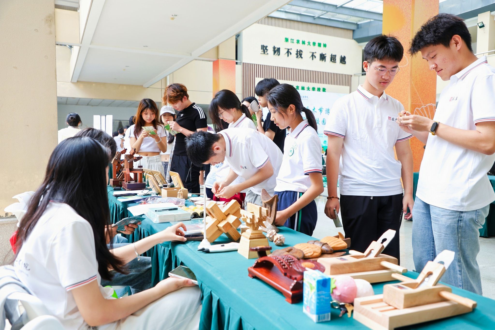 游园会设置了七大趣味互动环节,吸引着同学们纷纷驻足体验。爱木知识问答+手工制作,边学边玩涨知识;皂化方程式,感受化学与生活的奇妙结合;DIY扭扭花、文创漆扇,发挥创意制作专属作品;植物拓印,留存自然之美;还有趣味游戏如木块金字塔大挑战、智解木语谜题等,挑战与欢乐并存。
