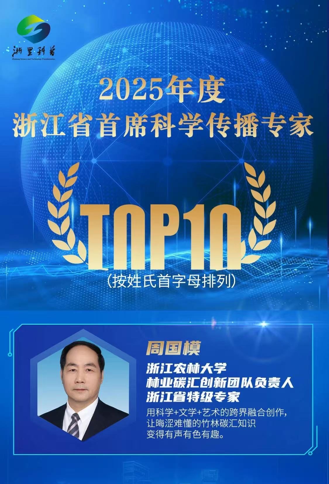 开云电竞s13生态文明研究院方向带头人周国模教授获2025年度浙江省首席科学传播专家TOP10。