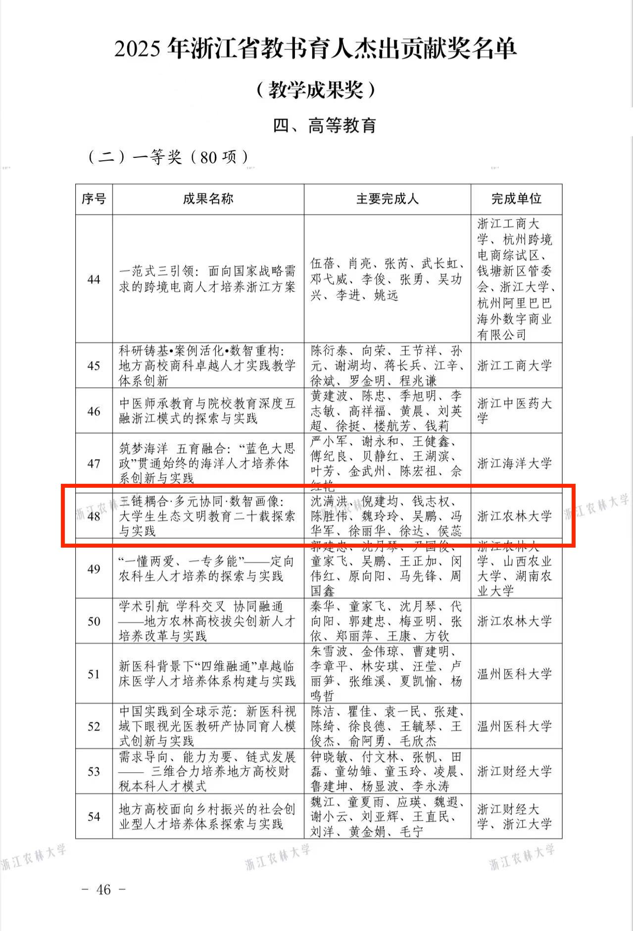 沈满洪教授主持的生态育人教学成果获省级教学成果一等奖
