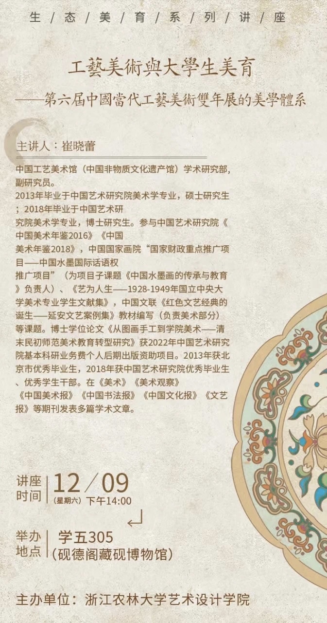 艺术设计学院坚持生态育人的理念,重视培养学生的传统文化和思想审美的内在精神。自2020年以来,学院连续四年举办了“生态美育”大讲堂系列活动。该活动已邀请了众多国内外学者专家为学生举办了近20场讲座。讲座主题涵盖传统艺术、文化生态、思政美育等方面,通过开启第二课堂的形式,帮助学生更好地理解和欣赏艺术和文化。如校友叶剑鸿的讲座《精石墨化 生态与人》从砚文化的视角阐释了中国文化的博大精深,浙大教授付俊的《读画——宋画中的乡村》则解读了宋韵文化,从绘画中解读宋人的生活和情怀。