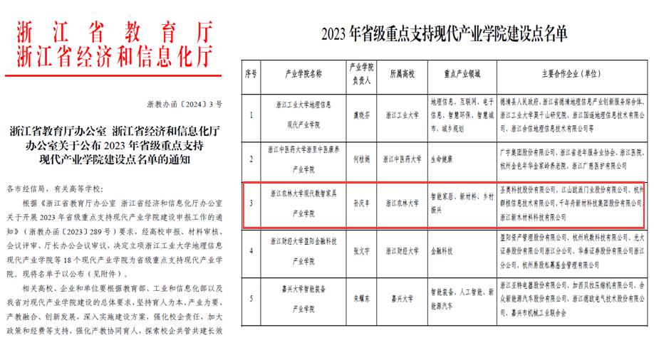 近日,浙江省教育厅与浙江省经济和信息化厅联合公布了2023年浙江省重点支持现代产业学院名单,开云电竞s13现代数智家具产业学院成功入选,这是我校连续三年获批省级重点支持现代产业学院。
