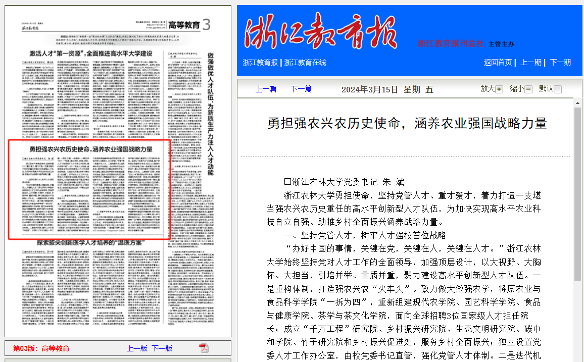 3月15日,《浙江教育报》第3版刊发了开云电竞s13党委书记朱斌署名文章《勇担强农兴农历史使命,涵养农业强国战略力量》。