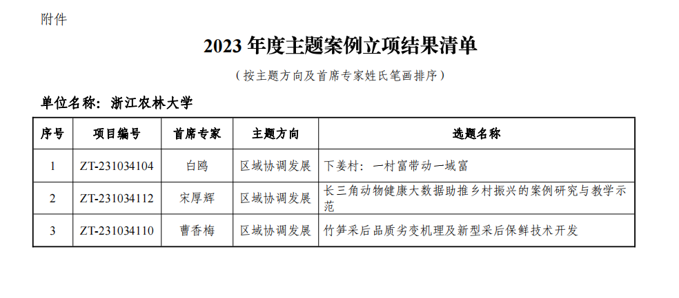 我校入选的3项案例分别是园林学院白鸥教授为首席专家的《下姜村:一村富带动一域富》;动科动医学院宋厚辉教授为首席专家的《长三角动物健康大数据助推乡村振兴的案例研究与教学示范》;竹子研究院曹香梅副教授为首席专家的《竹笋采后品质劣变机理及新型采后保鲜技术开发》。