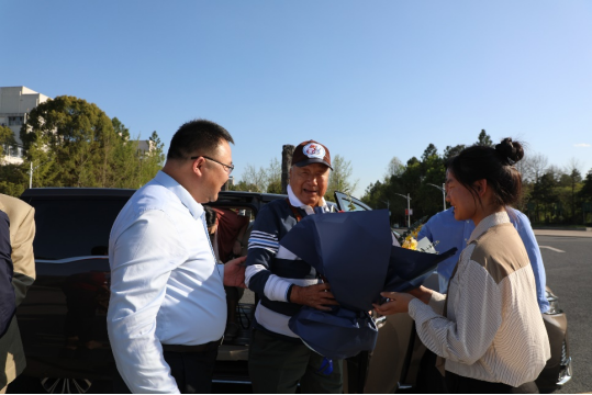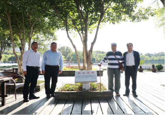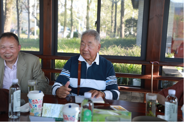 座谈会前,学生代表为陈每文先生献上鲜花。陈每文先生携家人步行至“饮水思源”碑,讲述了陈年井箍迁移和设立“饮水思源”碑的故事,感怀故园,感念慈恩。