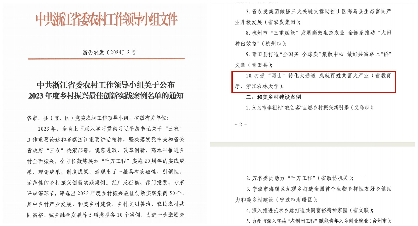 近日,浙江省委农村工作领导小组公布了2023年度全省乡村振兴最佳创新实践案例名单。我校服务乡村振兴的成果《打通“两山”转化通道 成就百姓共富大产业》入选乡村产业发展案例,这也是全省高校今年唯一入选的案例。