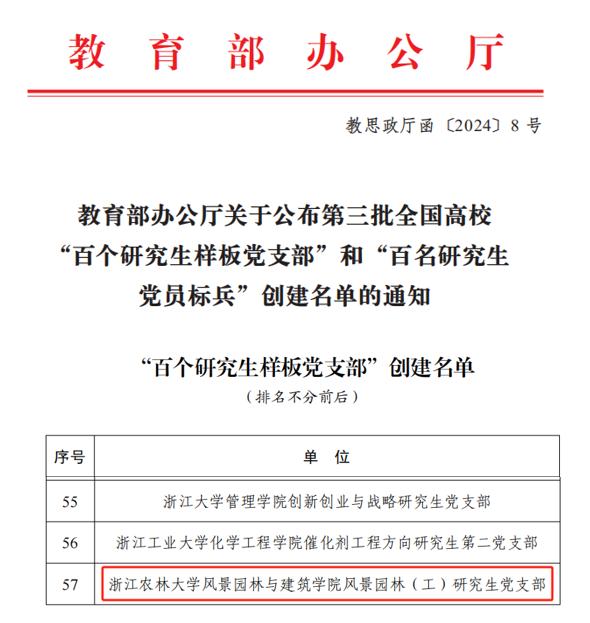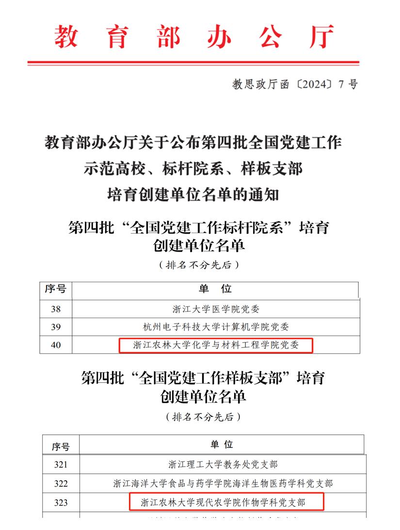 本次共评选产生全国党建工作标杆院系培育创建单位100个,全国高校“百个研究生样板党支部”创建单位100个,全国党建工作样板支部培育创建单位1001个。其中,我校化学与材料工程学院党委入选全国党建工作“标杆院系”培育创建单位,现代开云体育平台体验活动作物学科党支部入选全国党建工作“样板支部”培育创建单位,风景园林与建筑学院风景园林(工)研究生党支部入选全国高校“百个研究生样板党支部”培育创建单位。
