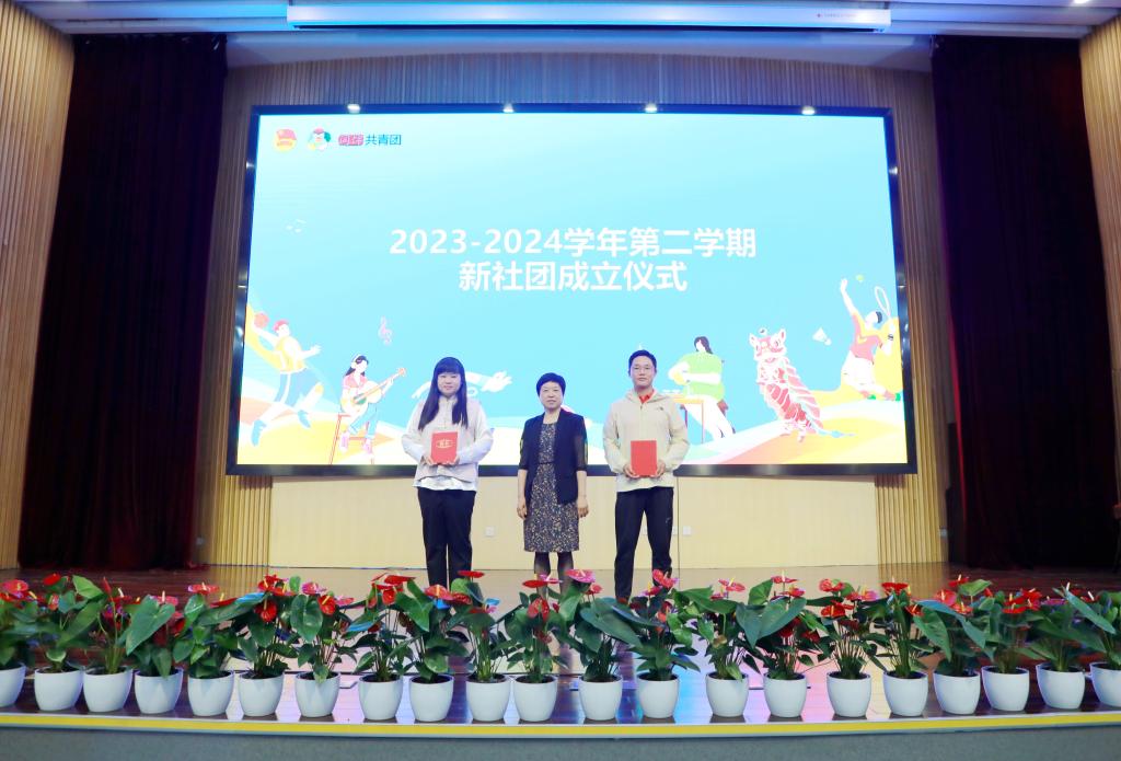 现场举行了2023-2024学年新社团成立仪式。沈希为新成立的丝韵葫芦丝社团、匹克球社团送上葫芦丝、匹克球拍。施美红为新成立社团指导老师颁发聘书。