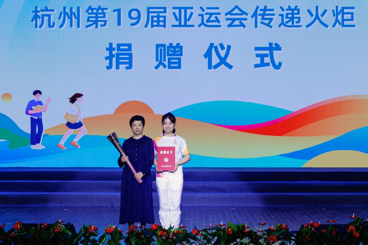 活动现场举行了杭州第19届亚运会火炬捐赠仪式。杭州亚运会火炬传递丽水站第165棒火炬手、我校城乡规划专业2020级学生吴素青捐赠亚运火炬。校党委副书记施美红代表学校接受捐赠,并为吴素青颁发捐赠证书。