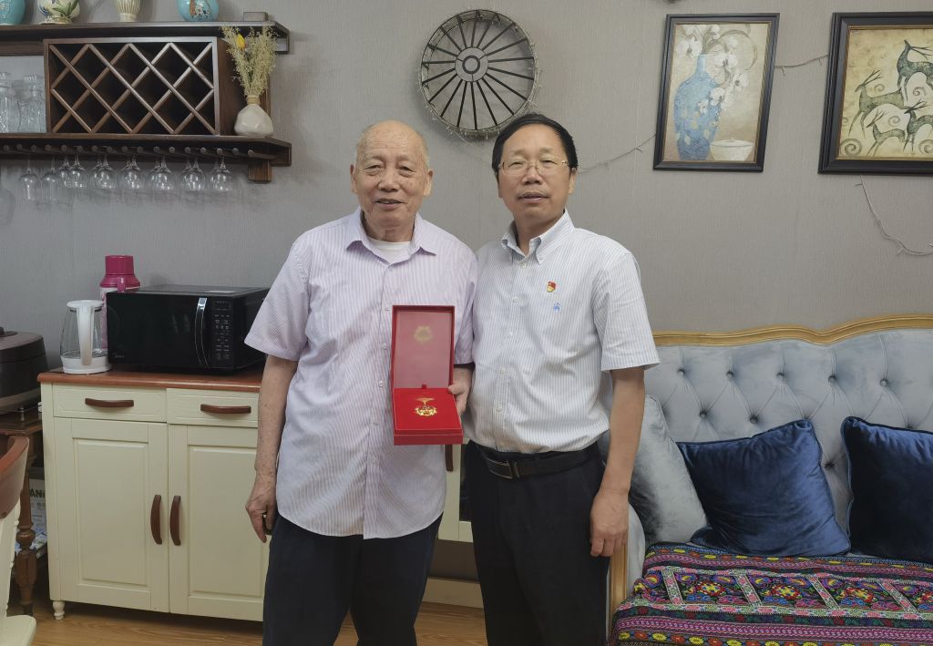 冯尚申一行慰问了老党员代表周汉祥和教师党员代表储小旵和张俊飚。在周汉祥家里,冯尚申为其颁发了“光荣在党50年”纪念章,感谢他对学校建设发展作出的贡献,并祝福老同志健康幸福。