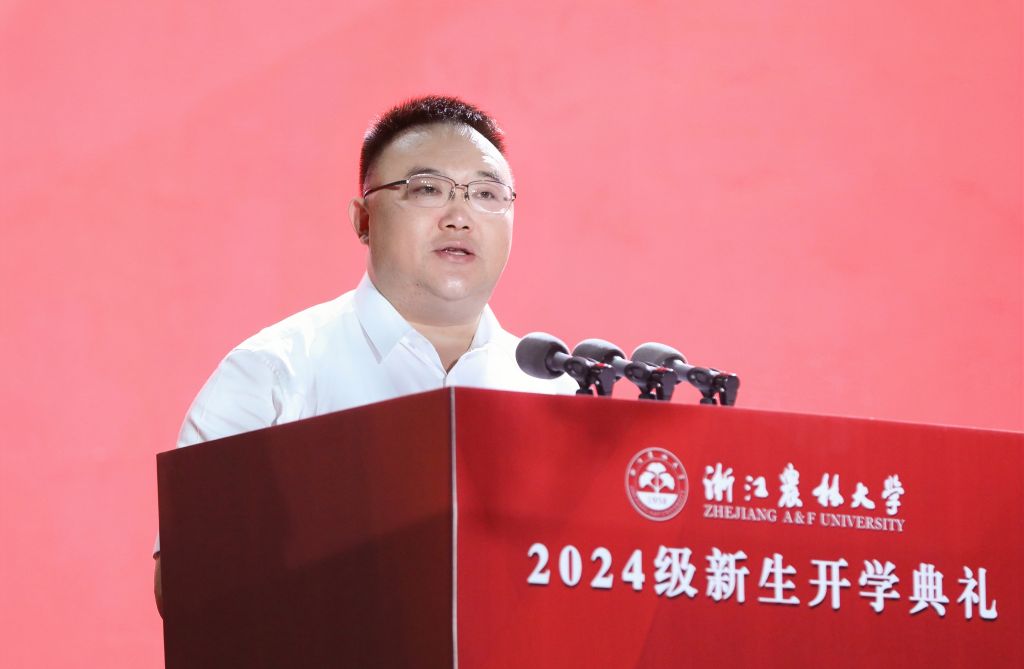 校党委书记朱斌教授代表学校对全体新生表示热烈欢迎,并作题为《从爱出发行未来》的讲话。他指出,当前学校各项事业已经迈入高质量、高水平、高速度发展的快车道,取得了包括进入浙江省“双一流196工程”高水平大学建设高校行列、林学学科列入登峰学科、荣获国家级教学成果奖一等奖、新农科教育教学中心大楼拔地而起等一系列成果。