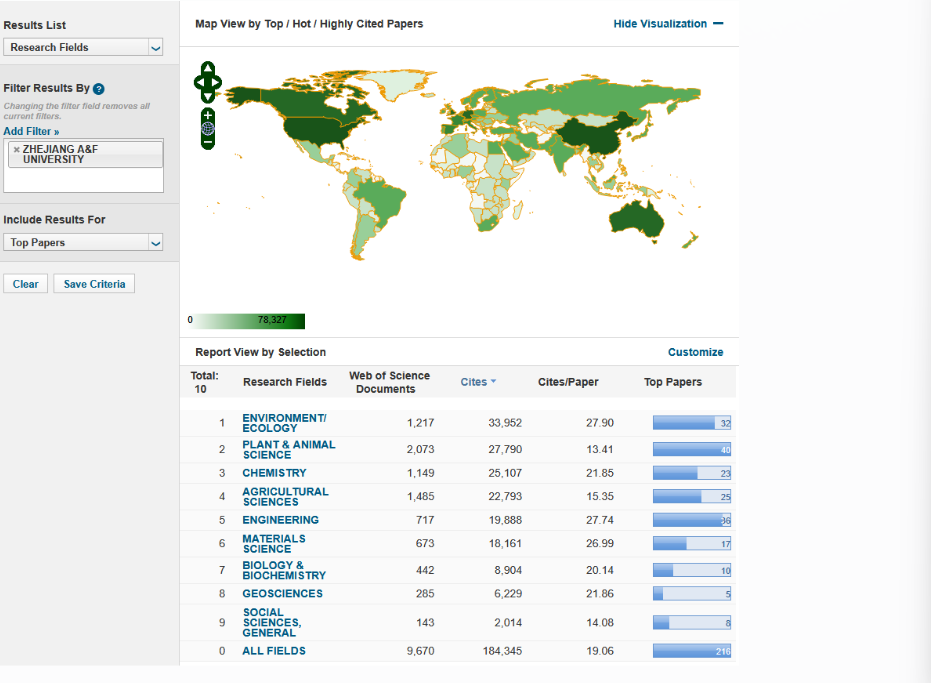 目前,我校共有植物与动物科学、农业科学、工程学、环境/生态学、化学、材料科学、生物与生物化学、地球科学、社会科学总论等9个学科领域进入ESI全球前1%行列。其中植物与动物科学、农业科学等2个学科领域进入ESI全球前2‰。