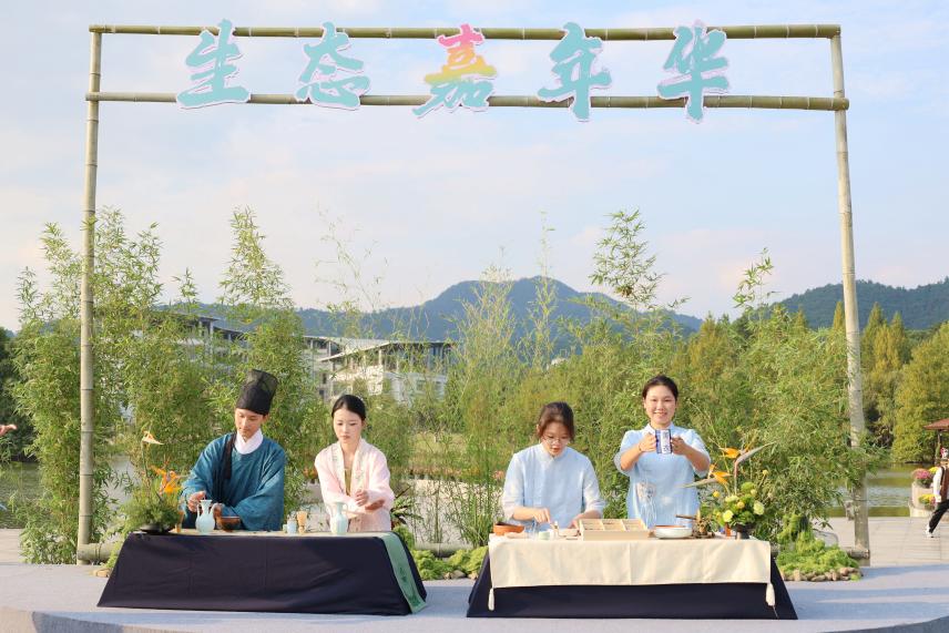 出席仪式的领导、嘉宾上台摇动“山核桃风铃”,共同启动本次生态嘉年华。