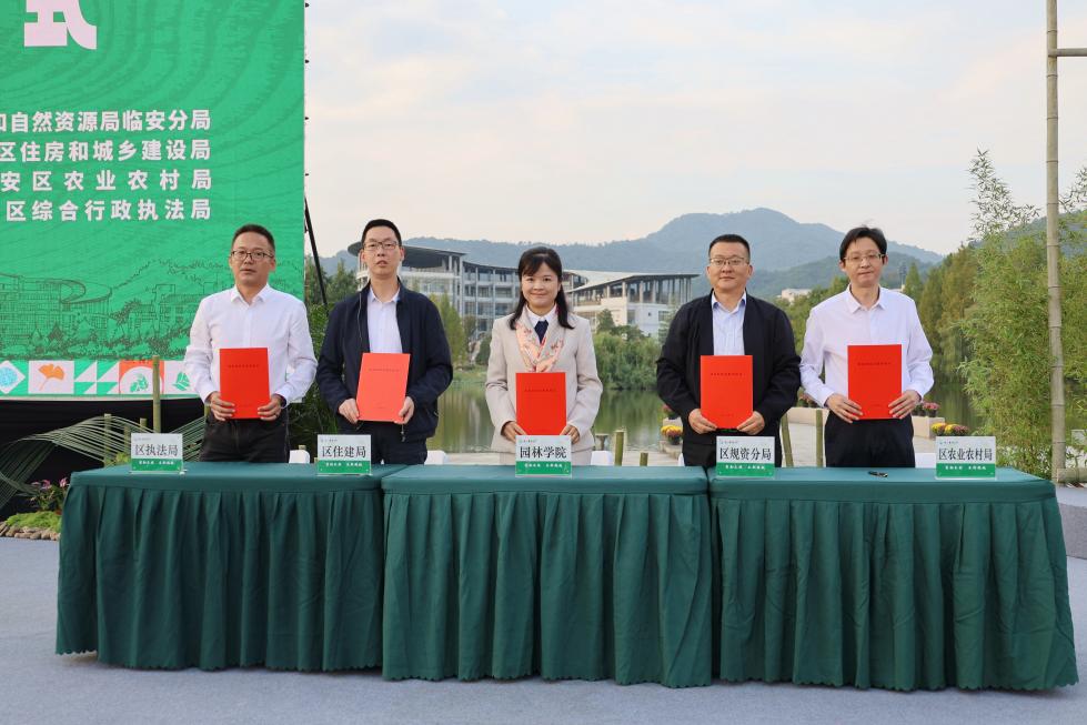 知联会与天目山镇签约,将聚焦天目山镇生态发展需求,提供智力支持与实践服务,助力地方生态建设;园林学院与临安区规资分局、住建局、农业农村局、城管局负责人分别上台签约,将选派园林特派员,精准对接临安全域生态园林、绿地景观设计服务需求。