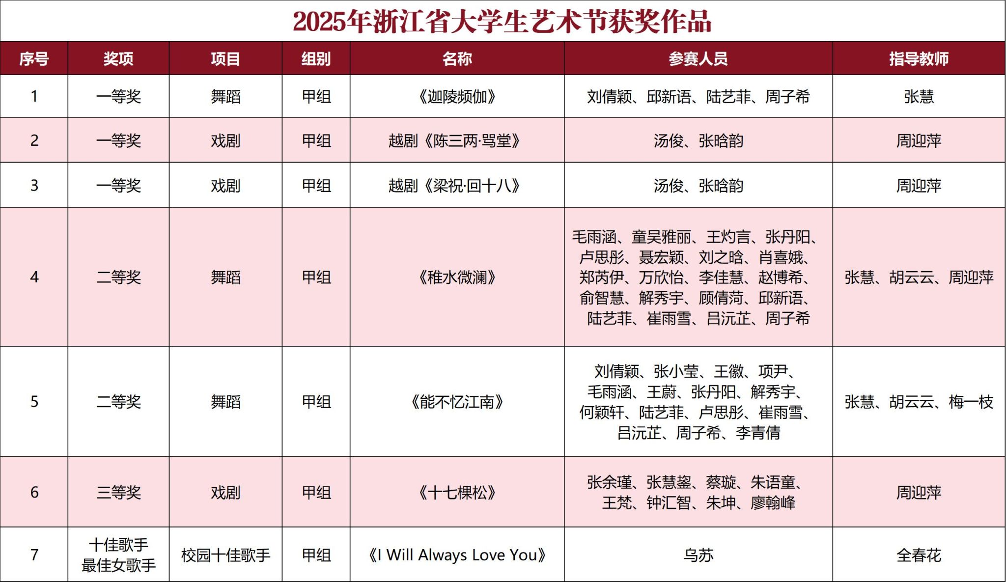 近日,2025年浙江省大学生艺术节的获奖名单揭晓。我校选送的8个作品成绩斐然:荣获戏剧项目一等奖2项、舞蹈项目一等奖1项、十佳歌手最佳女歌手奖1项,以及舞蹈项目二等奖2项、戏剧项目三等奖1项。我校再获优秀组织奖。戏曲作品《梁祝·回十八》和十佳歌手选手还获邀参加闭幕式展演。