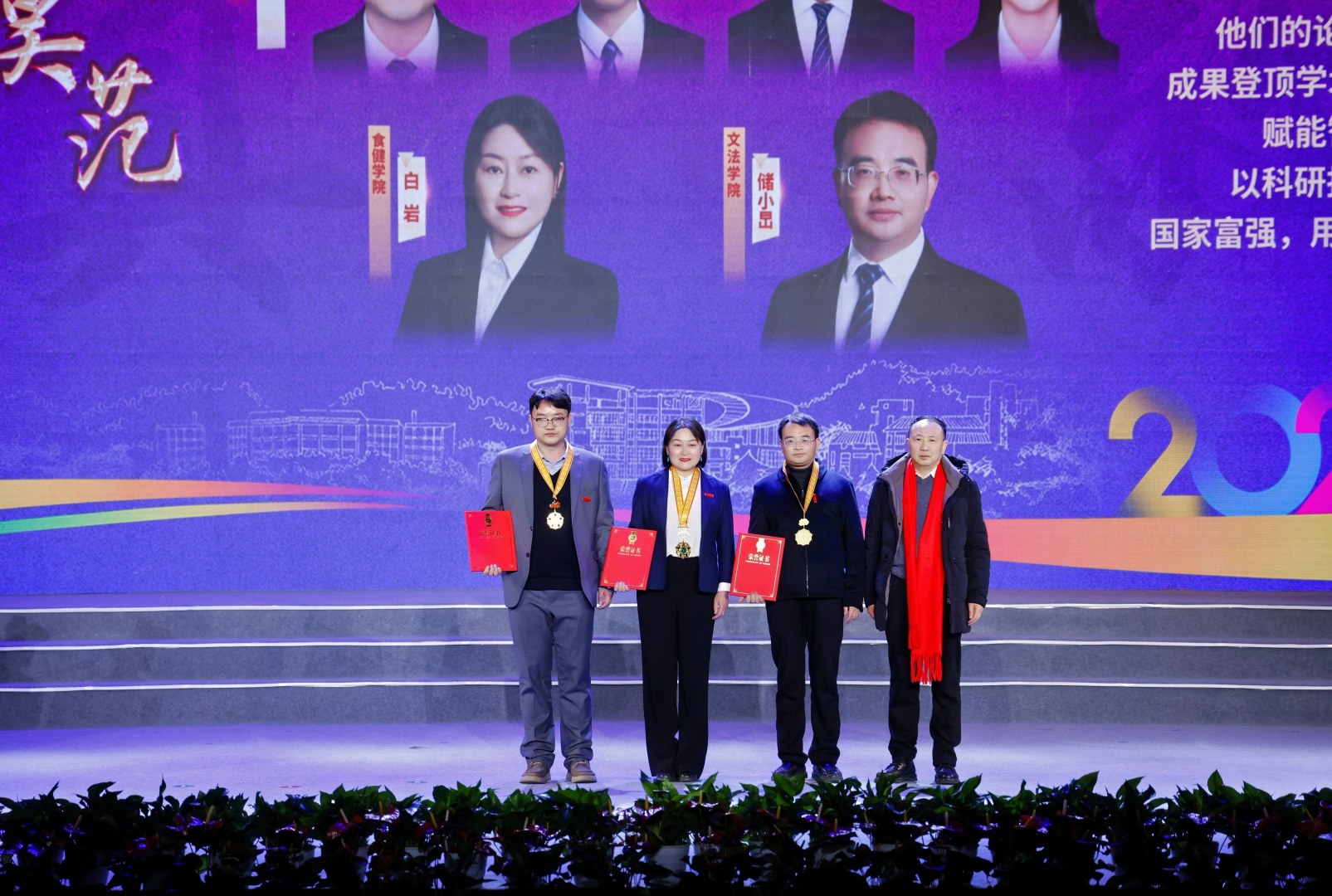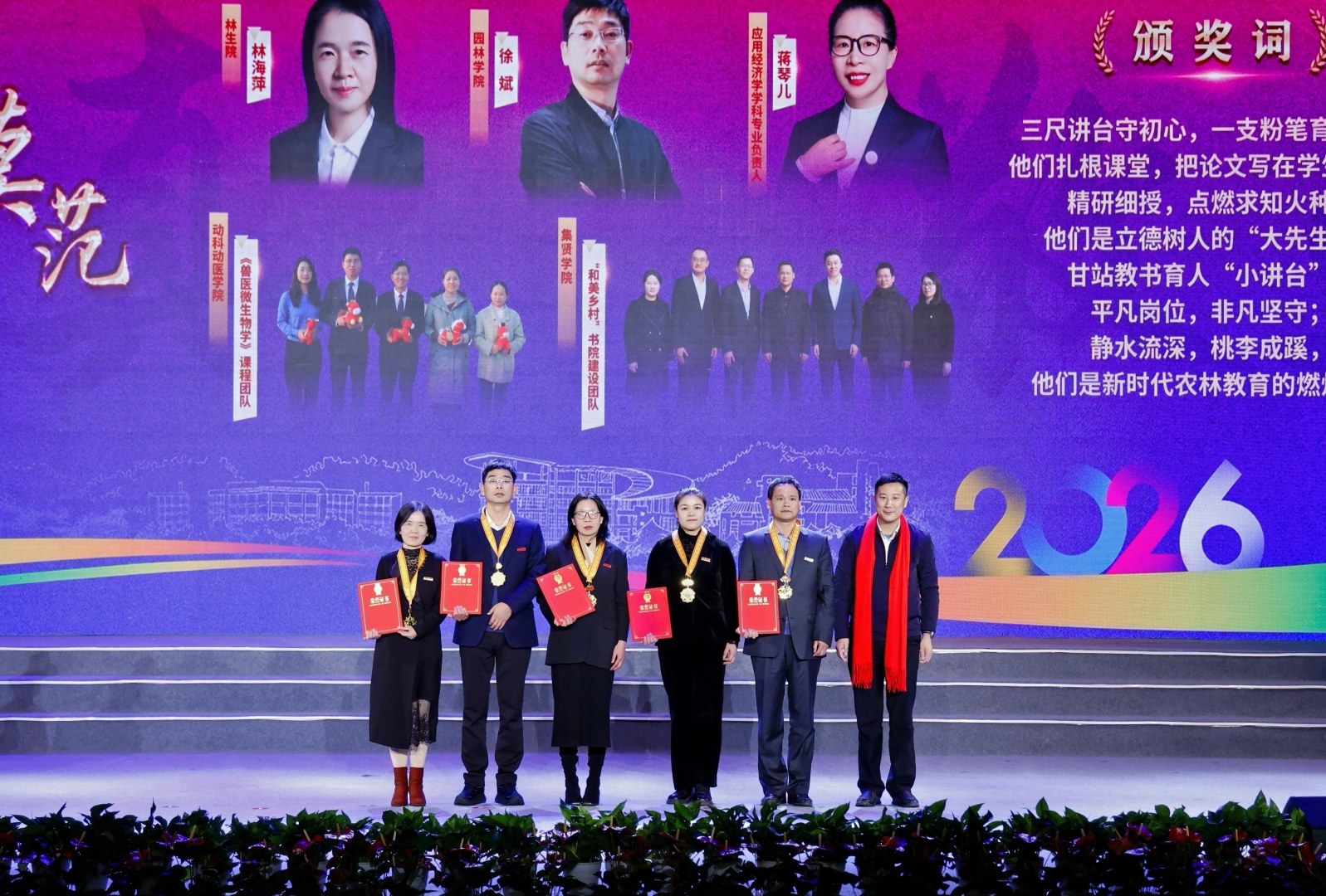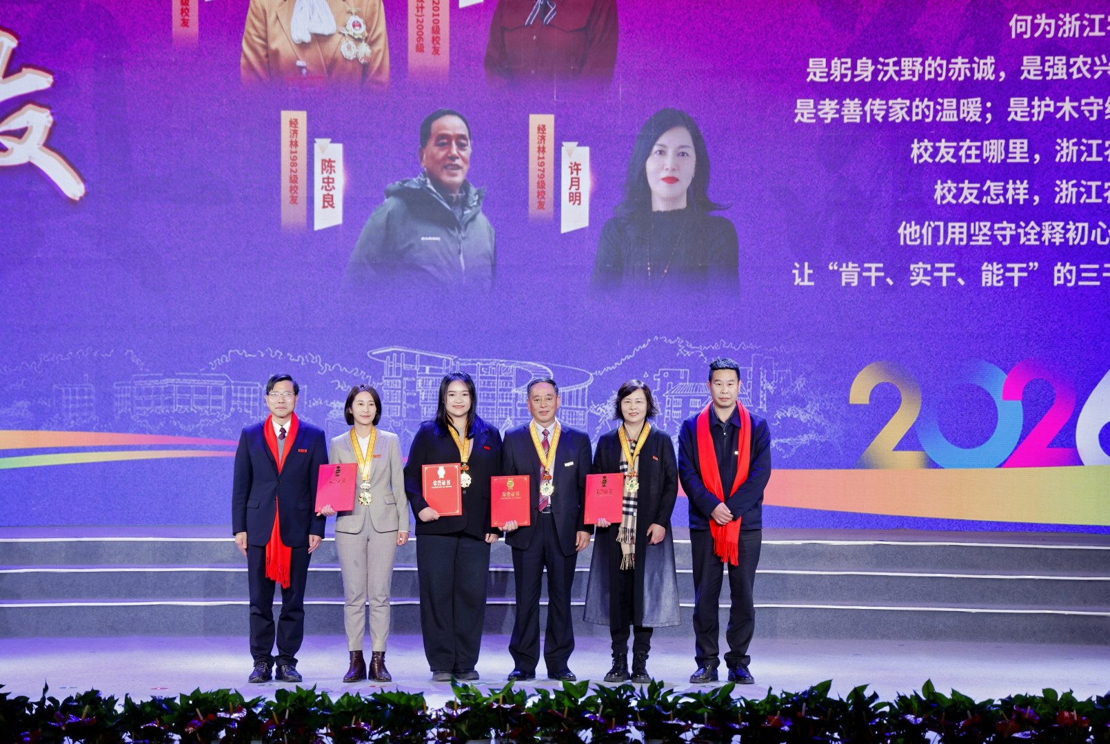 大会还对“红绿先锋”“桃李模范”“荣誉校友”等荣誉称号获得者和集体进行表彰,并授予“枫香勋章”。他们是德、智、体、美、劳全面发展,知识、能力、素质协同进阶的模范学子;是深耕教育沃土、践行教育家精神的“大先生”;是服务各领域、反哺母校发展的杰出校友代表。他们以卓越的表现,展现了浙农林大人的精神风貌。