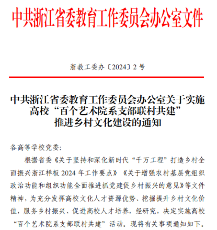 据悉,本次全省高校“百个艺术院系支部联村共建”活动由省委组织部统筹指导,省委教育工委组织推进,经前期调研、组织申报和综合遴选,全省高校共有149个项目入选。