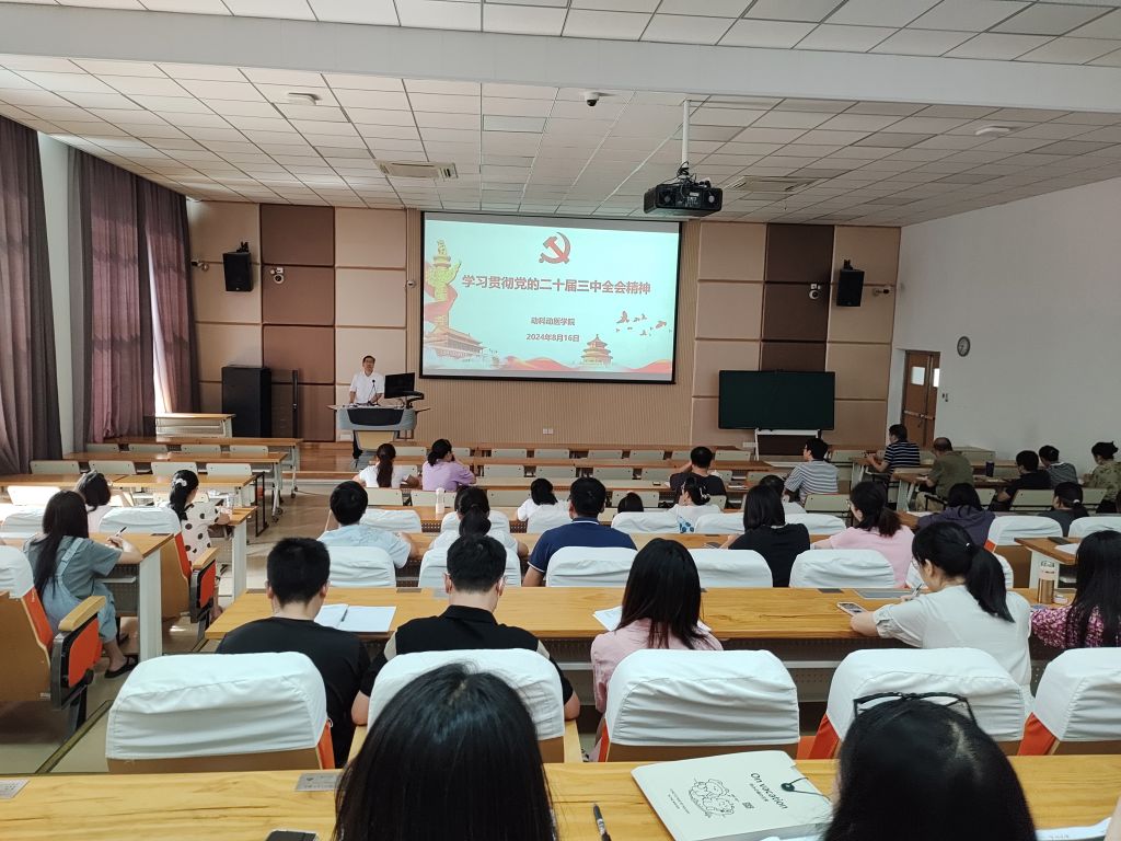 8月16日,校党委委员、动科动医学院院长宋厚辉在学2-201厚生堂宣讲党的二十届三中全会精神,兽医学科全体师生党员参加宣讲会。