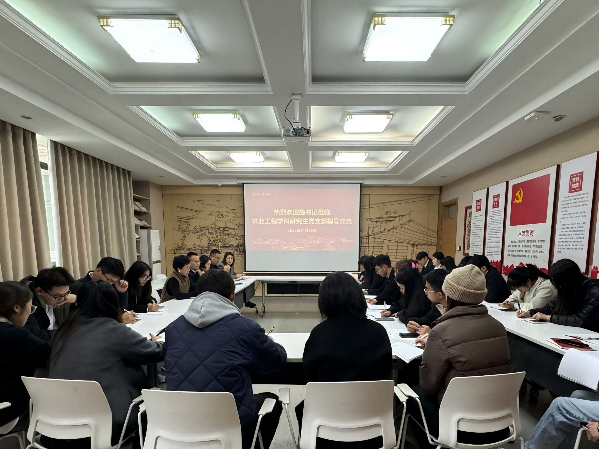 11月25日,校党委副书记施美红走访调研林业工程学科研究生党支部,并宣讲党的二十届三中全会精神。化材学院负责人以及党支部全体党员等30余名师生参与了此次主题党日活动。