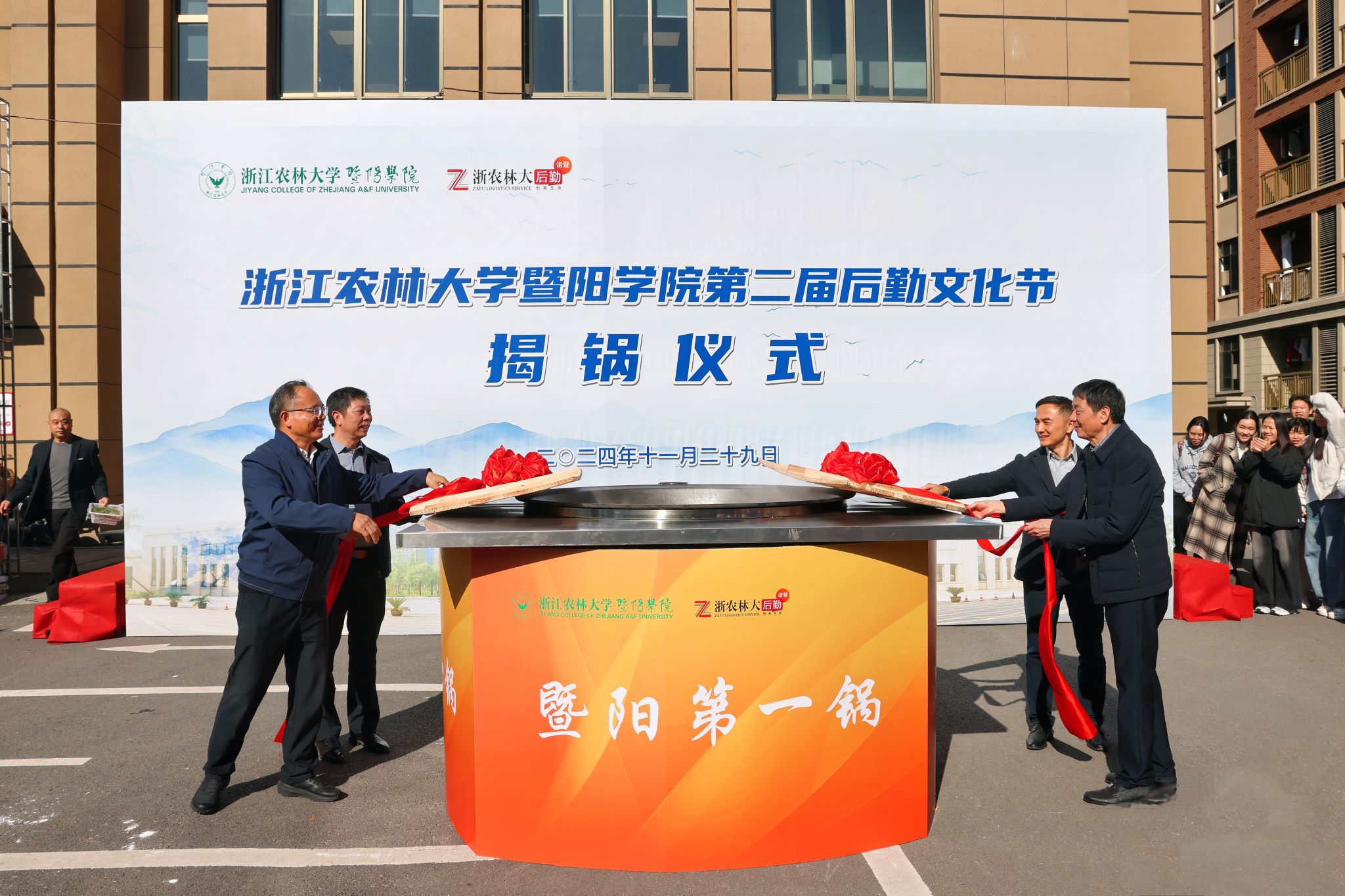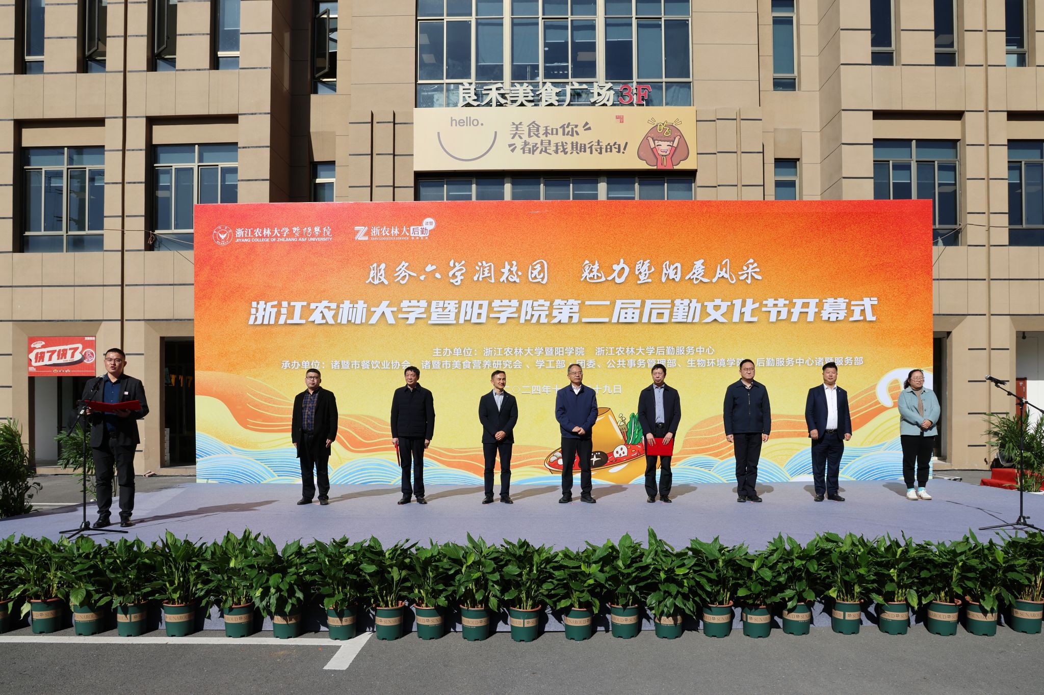 暨阳学院及后勤中心相关负责人,诸暨市餐饮业协会、学院学工部、生物环境学院相关负责人,诸暨服务部员工代表、学生代表等1000余人参加开幕式。