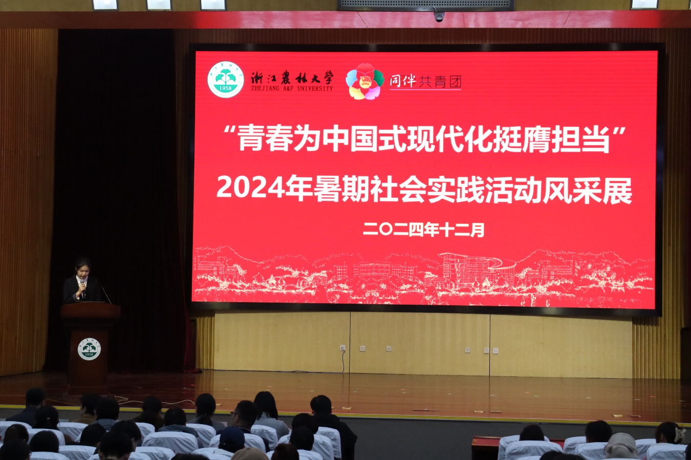 12月12日,2024年大学生暑期社会实践活动风采展于东湖校区图书馆第一报告厅举行,校党委副书记倪建均,校大学生暑期社会实践活动领导小组成员单位负责人,各二级学院党组织相关负责人,各二级学院团委书记,暑期社会实践“十佳团队”候选团队代表,观摩师生代表等500余人参加风采展。