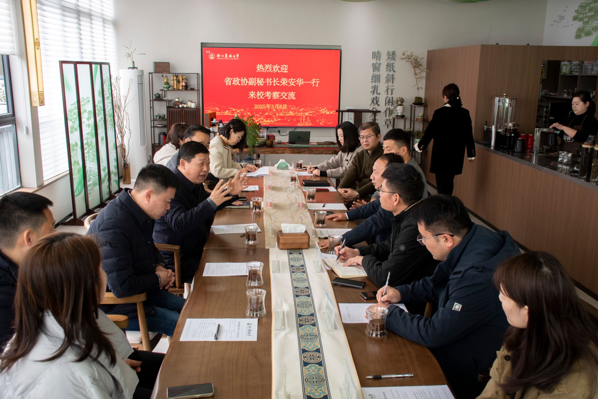荣安华对学校的热情接待表示感谢,并介绍了省政协委员活动中心茶空间设计方面有关情况。他表示,开云电竞s13在茶文化建设方面成效明显,底蕴深厚,值得借鉴。希望双方能够建立长期的互动关系,在茶产品更新展示、学生实习、茶学讲座、茶艺视频等方面为委员活动中心茶空间建设提供支持,助力建设好具有浙江特色、国内独有的茶空间。