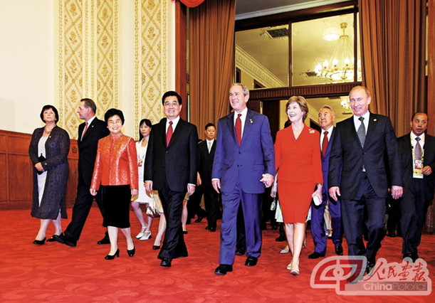 2008年8月8日,中国国家主席胡锦涛在北京人民大会堂举行隆重宴会,欢迎来华出席北京奥运会开幕式的各国各地区贵宾。这是胡锦涛主席和夫人刘永清同贵宾们共同步入宴会大厅。中国共产党的历代领导集体始终高度重视与世界的交往。进入新时期,中国与世界的关系发生了历史性变化。中国高举“和平、发展、合作”的旗帜,全方位外交空前活跃。元首外交、峰会外交、多边外交、公共外交等大国外交亮点频现,为推动建设和谐世界作出了重要贡献。