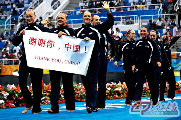 2008年8月23日,北京奥运会花样游泳集体项目自由自选决赛在国家游泳中心——“水立方”举行。美国队队员入场时,打出“谢谢你,中国”的条幅。2008年8月8日至24日,第29届夏季奥林匹克运动会在北京成功举办。来自204个国家和地区的1万余名运动员在16天里挑战极限、攀越新高,刷新了38项世界纪录和85项奥运会纪录,多个国家和地区实现了奥运会金牌和奖牌零的突破,奏响了更快、更高、更强的激情乐章,描绘了团结、友谊、和平的壮丽画卷。国际奥委会主席罗格在闭幕式上评价北京奥运会是一届“真正的无与伦比的”奥运会。