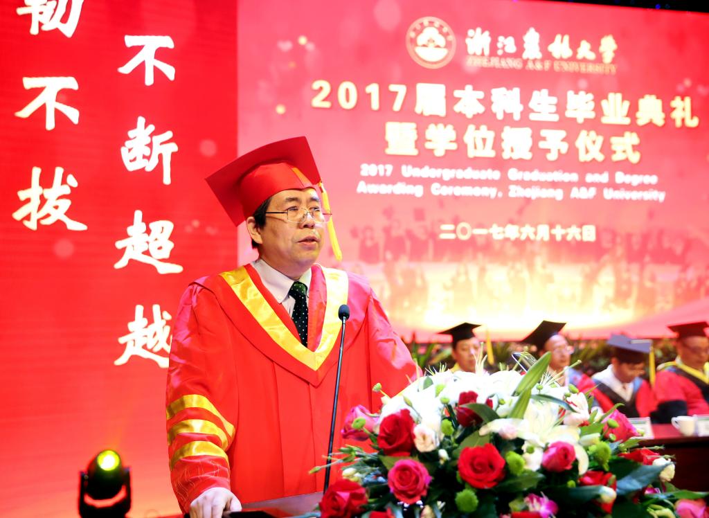 他希望同学们要拥有坚定的信念,志存高远、胸怀天下,仰望星空,树立起远大的理想抱负和视野格局,真正学会在顺势中洞察危机、于逆境中寻求希望,志存高远,在大好时代中干出一番伟业。希望同学们拥有坚定的信念,明德修身、德才兼备,把大学所学的勤学慎思、崇德向善作为人生信条,不断完善知识体系,孕育包容心态,锻造责任意识,养成浩然正气,将浙农林人肯干实干能干的“三干”优秀品质深耕浙江大地、播撒中华四方。希望同学们拥有坚定的信念,专注务实、精益求精,用“工匠精神”对待人生的每一粒扣子,踏实职业生涯的每一个脚印,开凿出一汪干事创业的源头活水,成为“三干”之人、担当之人、引领之人!