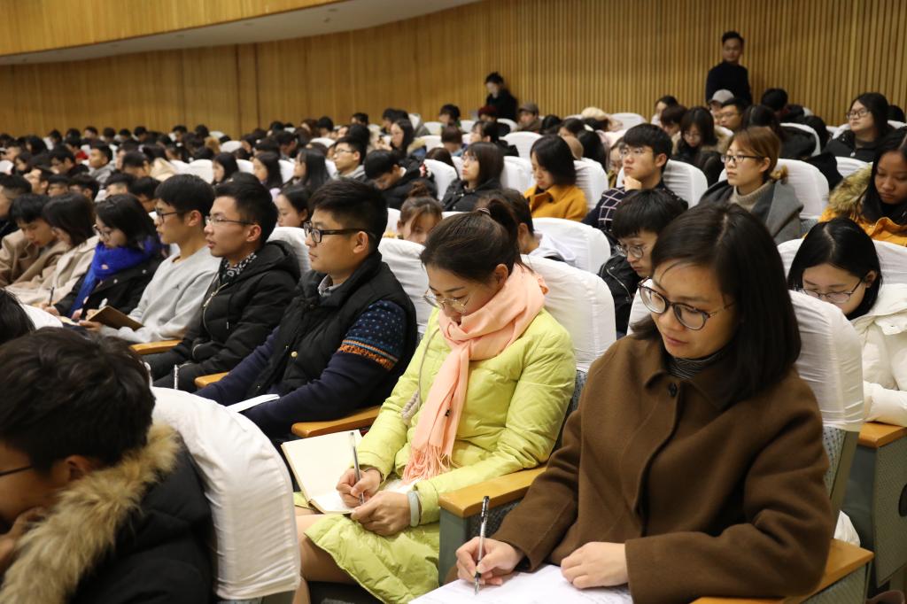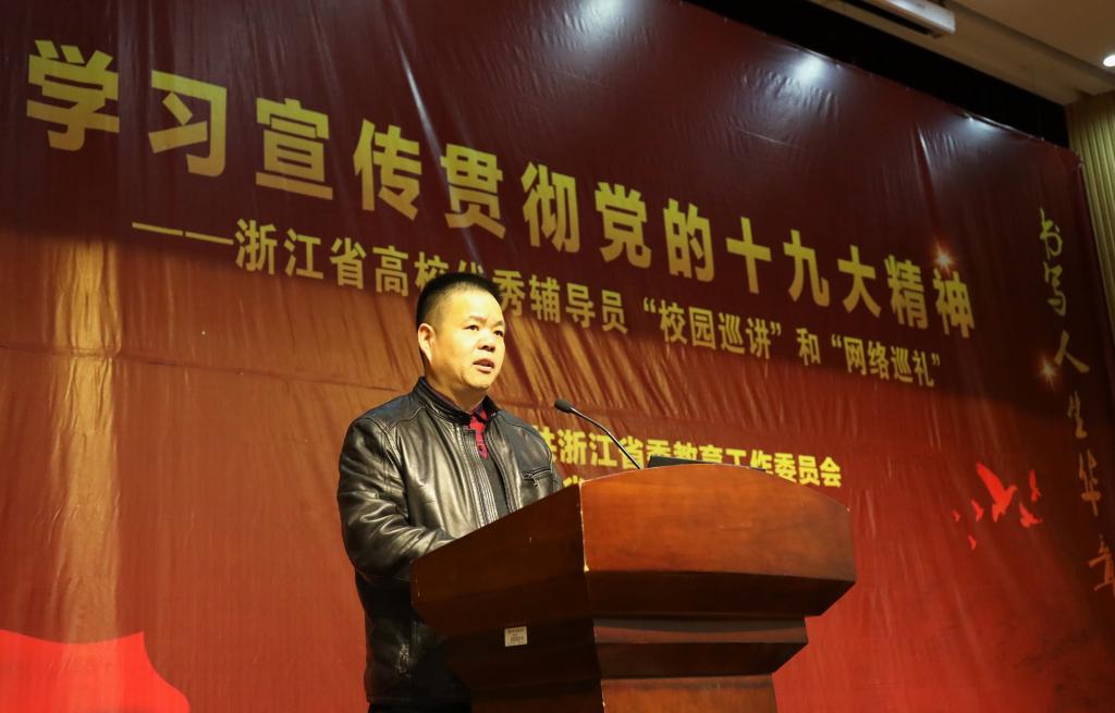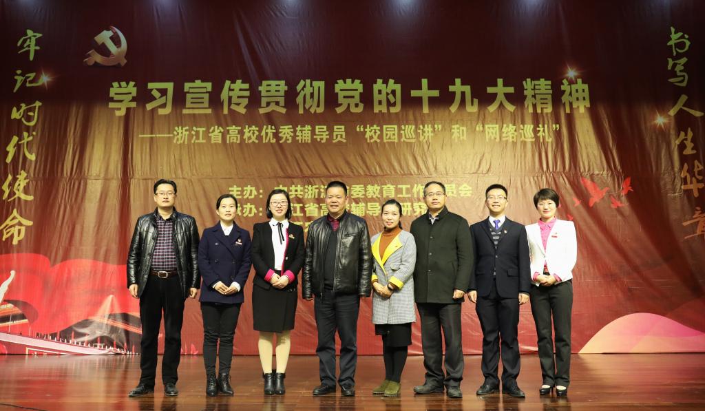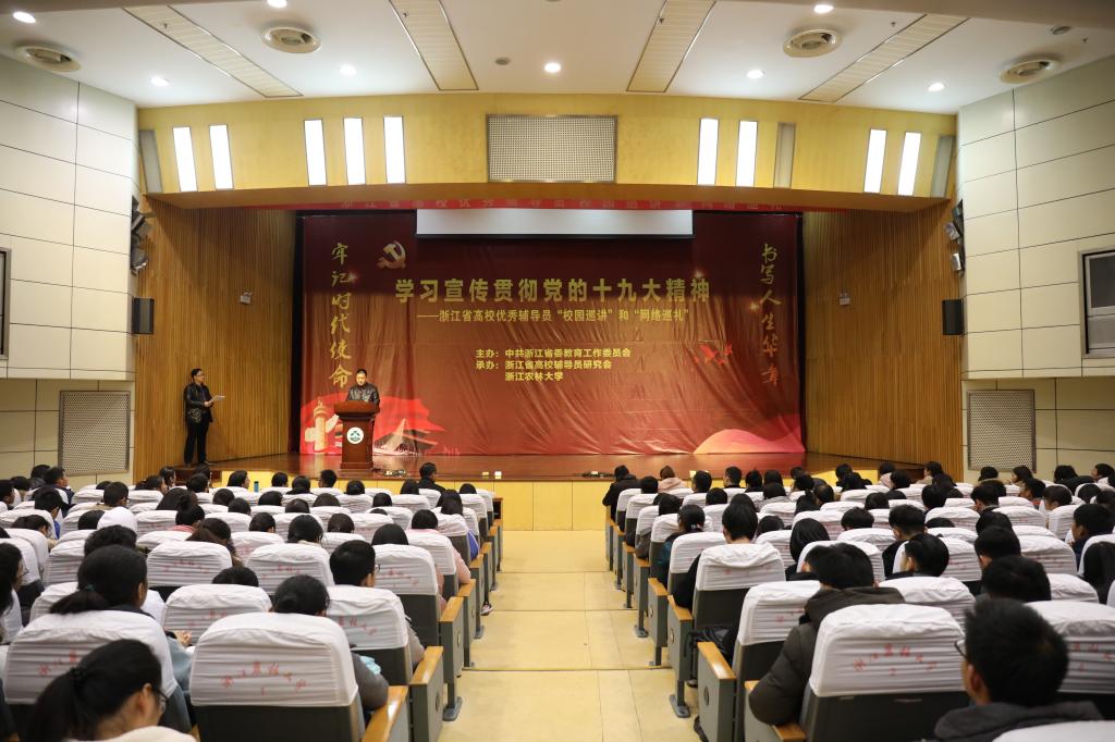 12月14下午,由中共浙江省委教育工作委员会主办的学习宣传贯彻党的十九大精神——浙江省高校优秀辅导员“校园巡讲”活动在我校图书馆第一报告厅举行。校党委副书记史永安出席活动并讲话,校党委委员、宣传部长胡祖吉以及学工部、研工部、团委负责人,各学院分管学生工作负责人,全体辅导员和500多名学生代表参加巡讲会。