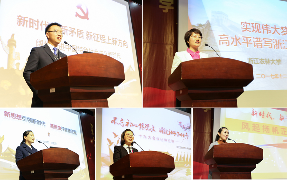 巡讲团成员浙江大学陈泽星、浙江科技学院邵晨昱、浙江工业大学毛诗焙、开云电竞s13宋春春、浙江外国语学院周礼分别围绕“新时代里新矛盾 新征程上新方向”“新思想引领新时代 新使命开启新征程”“不忘初心跟党走 撸起袖子加油干”“实现伟大梦想 高水平谱写浙江新篇章”“新时代,新青年,风起扬帆正当时”作主题宣讲。他们从学生的实际生活出发,用大学生感兴趣的方式、喜闻乐见的语言,接地气地宣讲党的十九大精神,让师生们对党的十九大精神有了更深刻的理解,更近距离感受到“中国梦”也是每个人的美好生活梦。