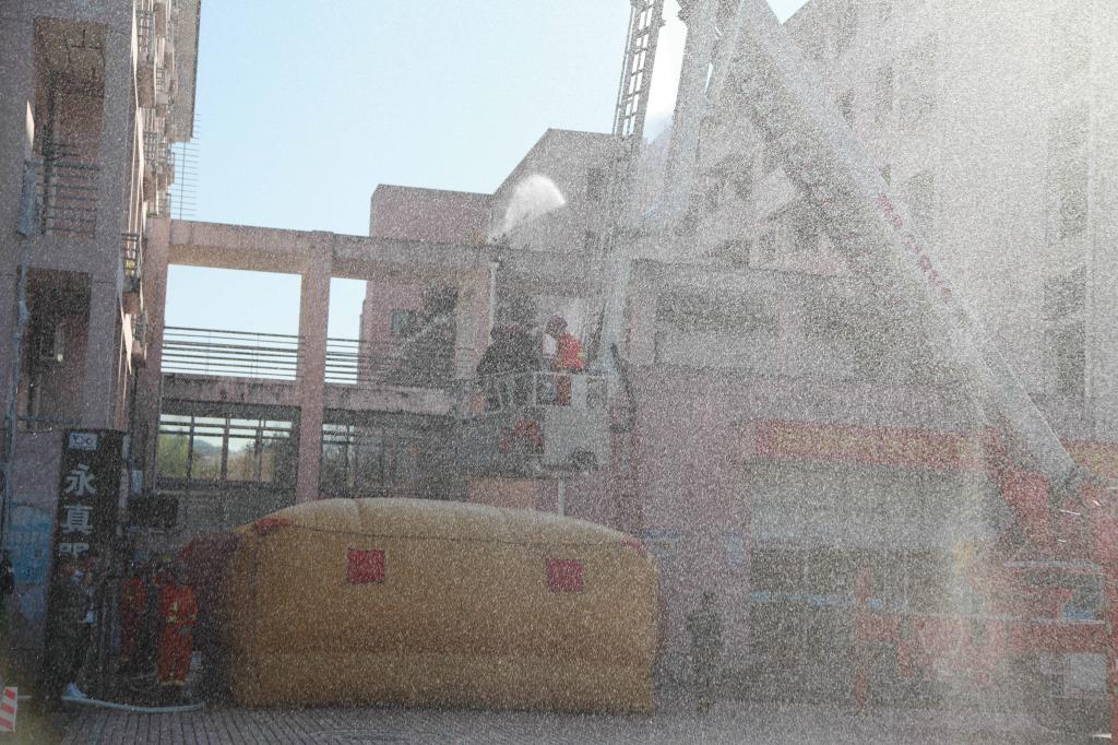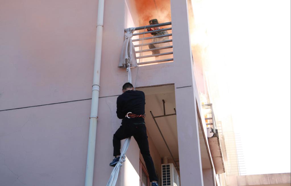 消防灭火救援演练开始。A3、A4学生公寓浓烟四起,学生发现火情后,紧急呼救,公寓管理员立即拨打“校园110”报警并发出火警信号,指挥中心接警后,迅速启动开云电竞s13突发事件应急处置预案,指挥应急队员及校卫队员赶赴“火灾现场”开展灭火、警戒和人员疏散。楼宇疏散引导员指挥被困学生用湿毛巾捂住口、鼻,单列、靠右沿楼道有序撤离。第一梯队学生公寓志愿消防员火速达到现场施救,随后,第二梯队微型消防站消防队员、志愿消防队员紧急到达火灾现场救援。临安区消防大队接警后,出动应急救援车、消防车等多辆消防车和30余名消防官兵,及时赶到现场救援,消防官兵充分运用高空云梯、竹梯、气垫、高空缓降等方式,施救被困人员,待人员有序撤离后,迅速扑灭火患。