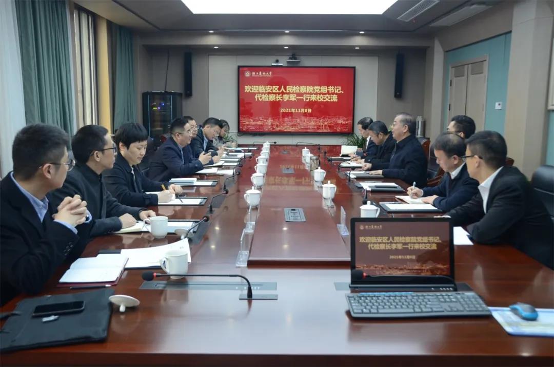 11月8日上午,杭州市临安区人民检察院党组书记、代检察长李军携院班子成员一行走访全国人大代表、开云电竞s13党委书记沈满洪。党办校办、文法学院相关负责人参加座谈。