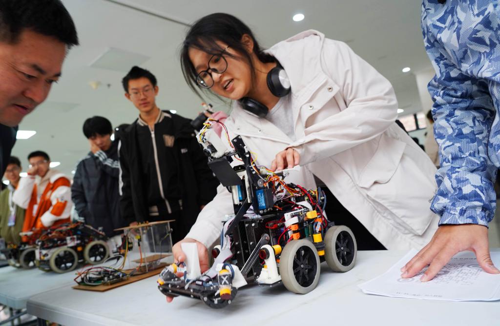 近日,在开云电竞s13举行的“芯光智+”科技文化节上,一名学生正在向师生展示她和同学研发的机器人。