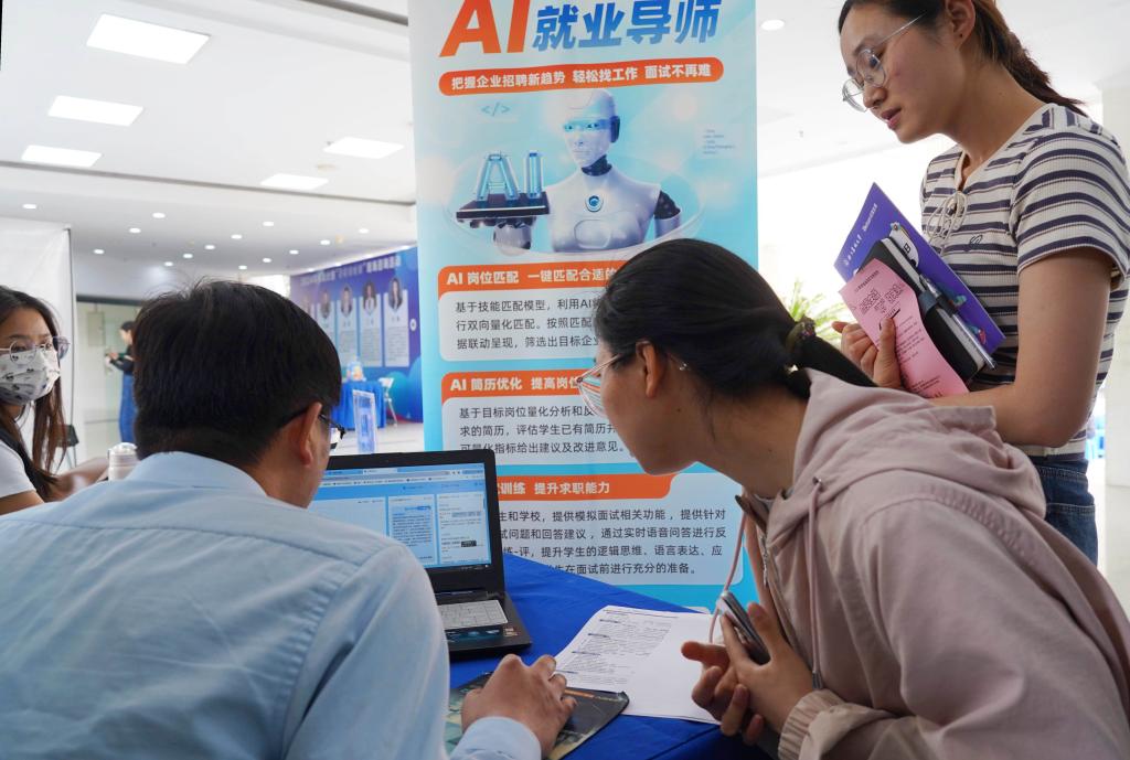 图为一名学生带着求职简历请“AI就业导师”指导完善求职简历、选择求职岗位、提升面试技能。