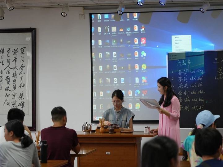 参加体验活动的是一群来自美国华府青年义工俱乐部的华裔青少年们。茶学院专任教师王园瑞博士与茶学院21级学生刘星雨为他们准备了一堂中英文结合的中国茶艺教学课。