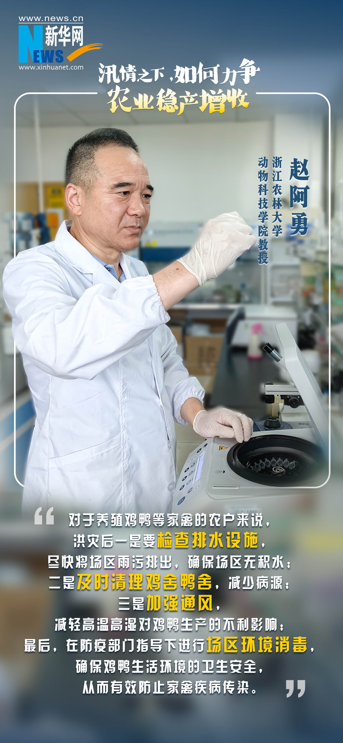 由于持续暴雨的影响,温度、湿度都发生了变化,雨污集聚增加,为病菌滋生和传播创造了条件,容易引发家禽生病甚至瘟疫。对于养殖鸡鸭等家禽的农户来说,洪灾后一是要检查排水设施,尽快将场区雨污排出,确保场区无积水;二是及时清理鸡舍鸭舍,减少病源;三是加强通风,减轻高温高湿对鸡鸭生产的不利影响;最后,在防疫部门指导下进行场区环境消毒,确保鸡鸭生活环境的卫生安全,从而有效防止家禽疾病传染。
