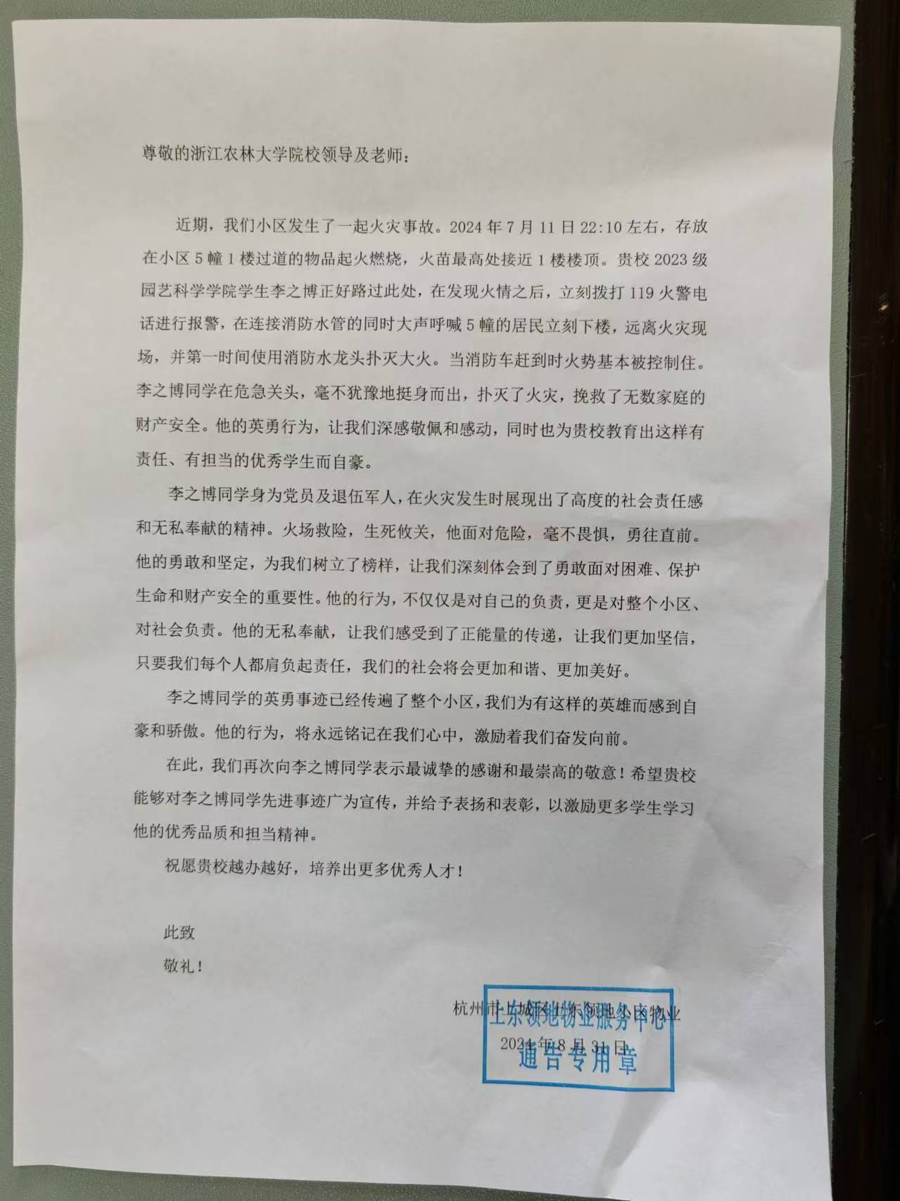 “尊敬的开云电竞s13校领导及老师:近期,我们小区发生了一起火灾事故。2024年7月11日22:10左右,存放在小区5幢1楼过道的物品起火燃烧,火苗最高处接近1楼楼顶。贵校2023级园艺科学学院学生李之博正好路过此处,在发现火情之后,立刻拨打119火警电话进行报警,在连接消防水管的同时大声呼喊5幢的居民立刻下楼,远离火灾现场,并第一时间使用消防水龙头扑灭大火……”