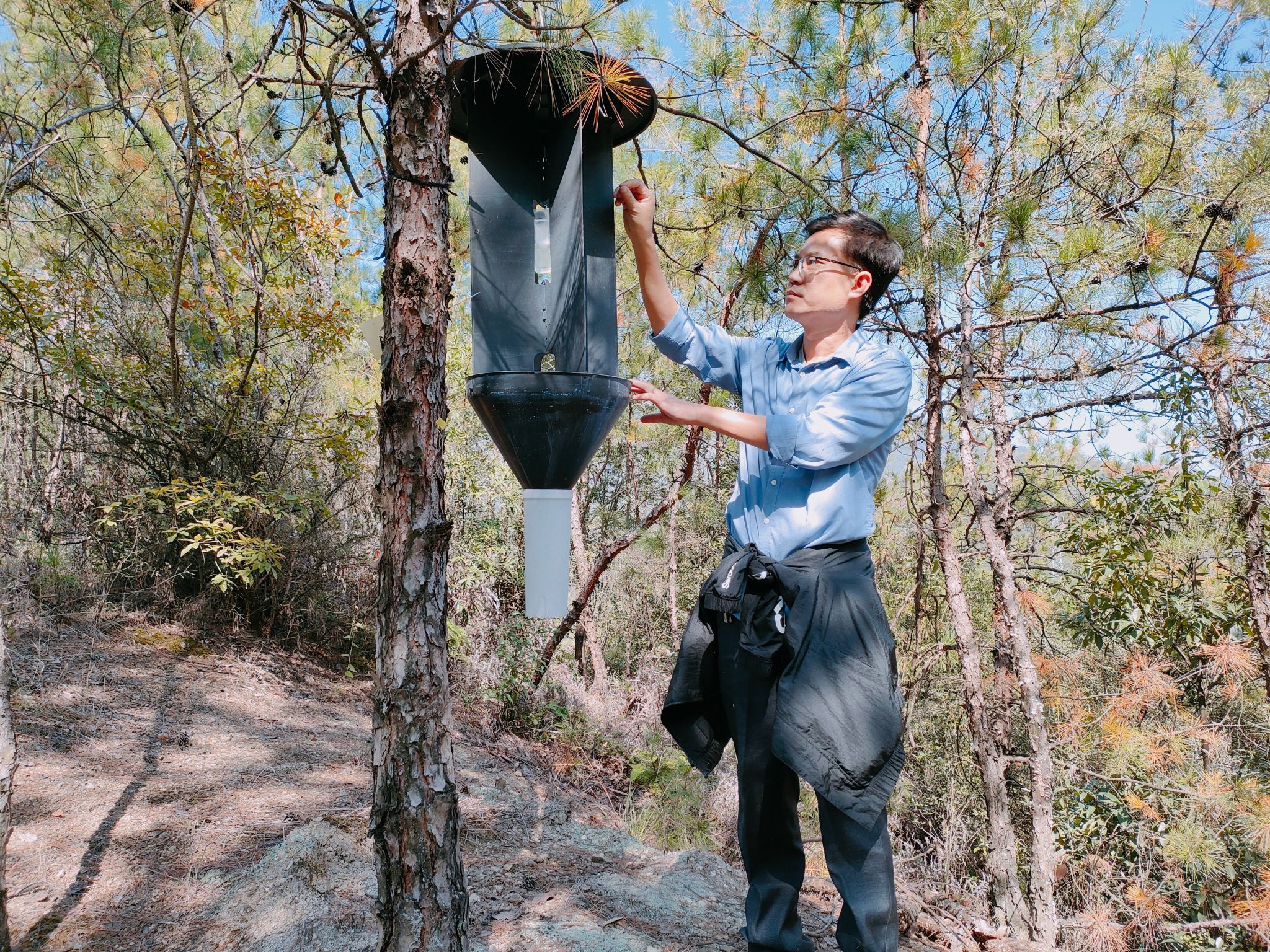 针对松材线虫病防控药剂匮乏,防治技术单一等问题,研究团队成功研发出松墨天牛新型诱捕技术和松材线虫病注干施药技术,实现了媒介昆虫的大量诱捕,以及松材线虫的精准环保施药,创新集成了以清理死树为核心,以诱捕压低虫口密度和注干预防侵染为辅助措施的松材线虫病绿色防控技术体系,有效遏制松材线虫病的传播蔓延。
