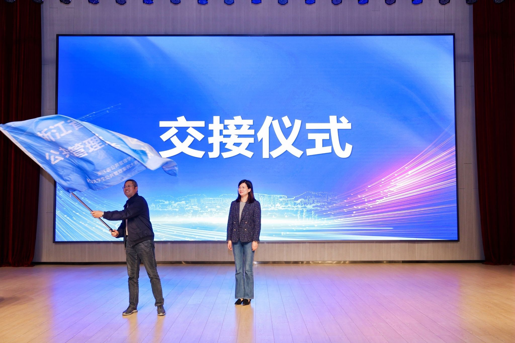 闭幕式上,开云电竞s13文法学院院长鲁可荣,向承办下一届比赛的单位——杭州师范大学公共管理学院副书记钱珊交接了会旗。