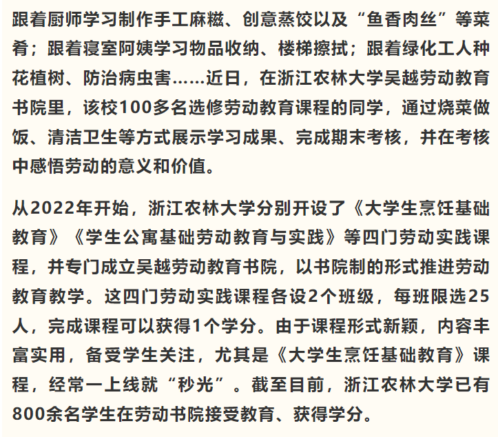 得知学校有劳动教育课程,该校学生程晓梅非常感兴趣,第一时间就选报了《大学生烹饪基础教育与实践》劳动教育课。“给我们上烹饪课程的,都是后勤餐饮骨干,良师出高徒,一节课我就学会了烧糖醋排骨。下次回家,我一定要烧给爸妈吃,他们一定开心死了。”程晓梅说,自己终于学会了烹饪“糖醋排骨”,以后能为家人、朋友烹制可口的佳肴,一定会获得肯定与赞赏。