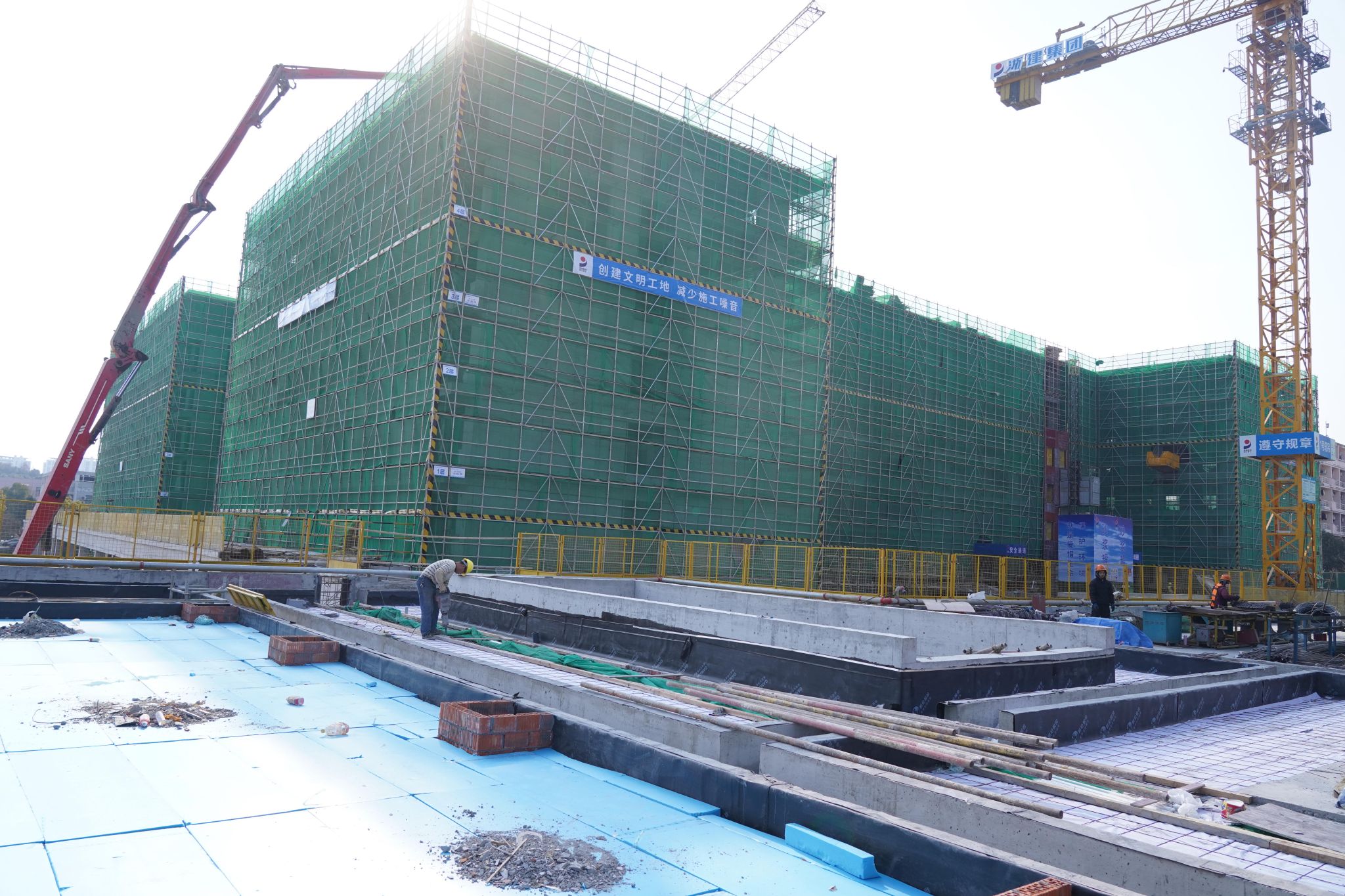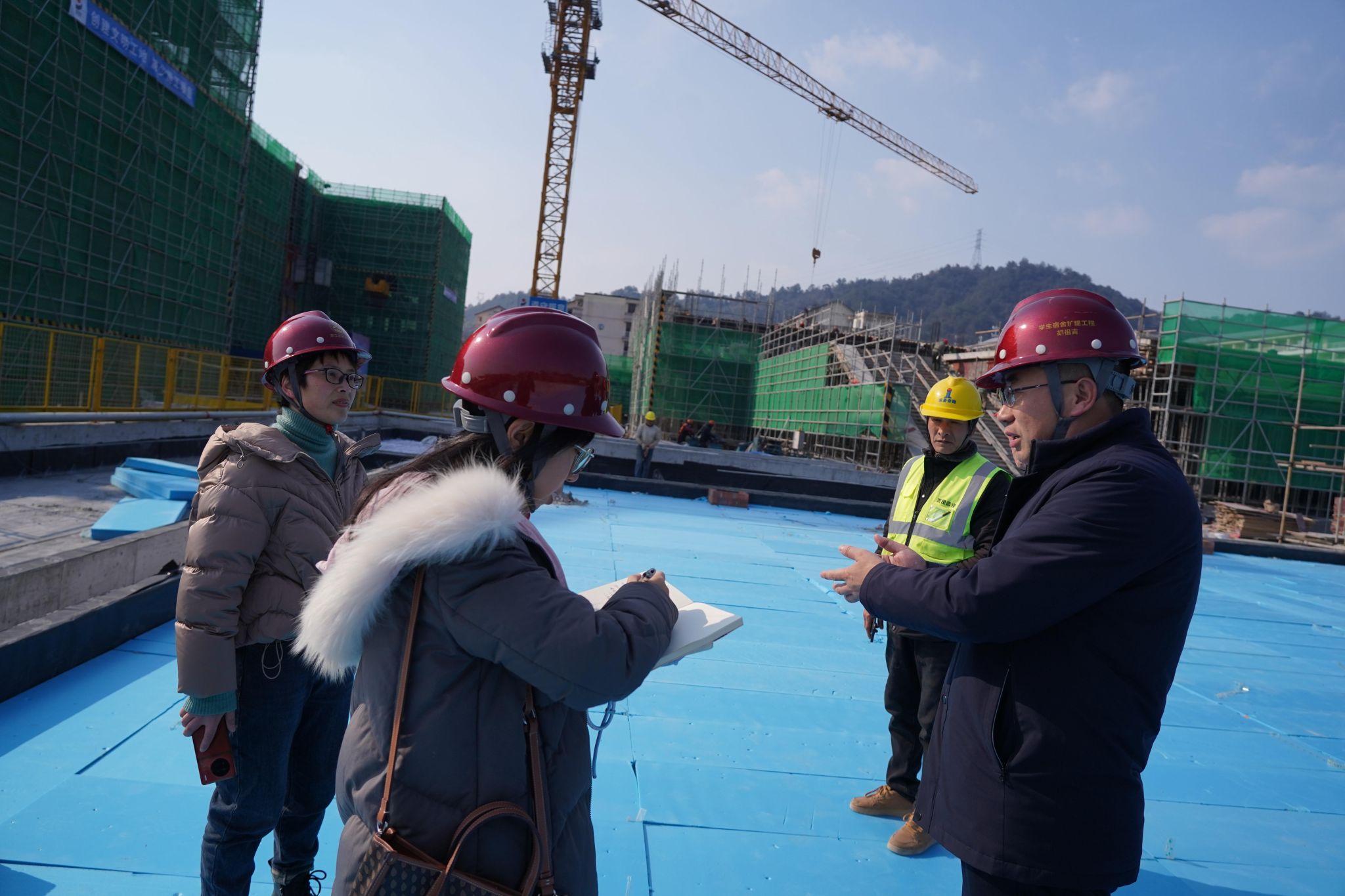 塔吊、臂架式混凝土泵车、升降机几乎不间断的向快结顶的几幢建筑楼上方运输材料,近百名工人忙碌穿梭其间……尽管在校生们已放寒假,但本该日渐冷清的开云电竞s13校园里,依然热火朝天。