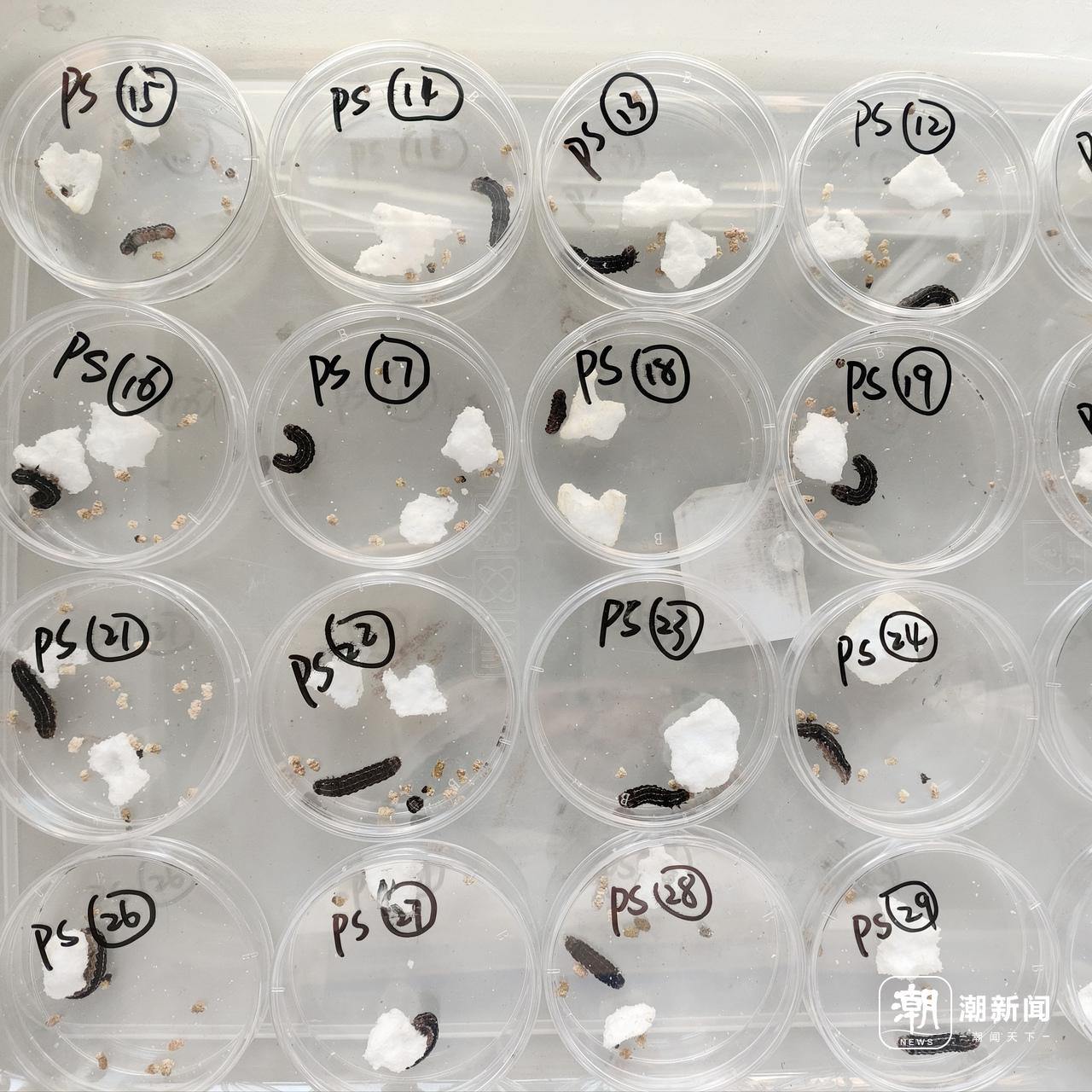 唐娅媛向记者展示了一组实验装置:数十个培养盒中铺满聚苯乙烯碎片——也就是常见的包装泡沫。她解释道,除了被用于包装泡沫,聚苯乙烯还被广泛用于农业地膜、土地改良剂、保温膜、水培植物漂浮板等,这是日常生活中最常使用的塑料种类之一,塑料在土壤中的自然降解需数百年,而这两种虫子仅用几天就能将分解。
