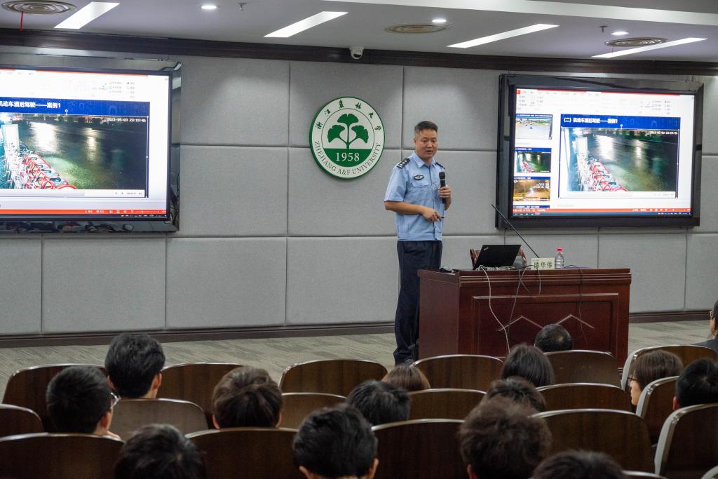 学院学生工作相关负责人用详实的数据向同学们介绍了目前校内交通情况。她表示校园交通安全问题跟我们每一个人的生活息息相关,我们每一个人都应该为守护平安校园出一份力,希望同学们通过本次讲座学会怎样保护自己的人身安全,切实掌握守护校园安全的本领。陈华伟警官运用真实案例视频,将不规范驾驶电动车所带来的严重后果生动地呈现在师生的眼前。在观看视频的同时,陈警官结合实际案例,详细而深入地讲解了在校园内规范驾驶电动车的具体要求和注意事项。对于交通事故的预防,陈警官指出需要自觉遵守交通法规、提高交通安全意识、掌握防御性驾驶技能。