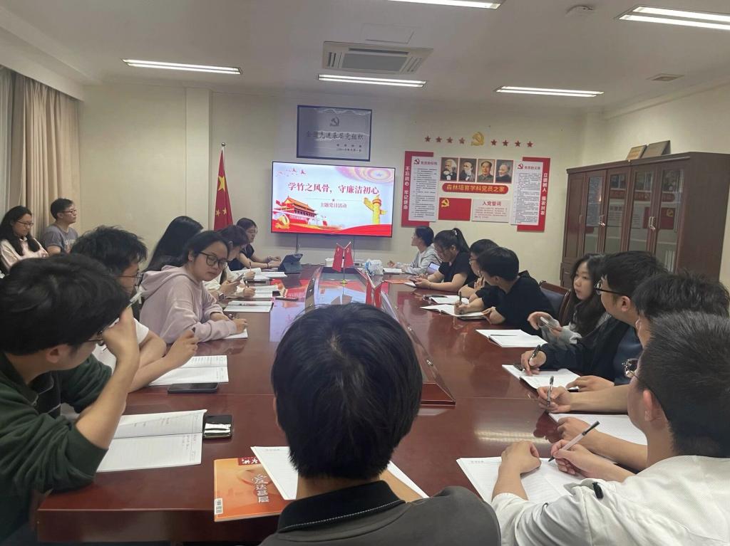 近日,竹子研究院研究生第一党支部结合党纪学习教育开展“学竹之风骨,守廉洁初心”主题党日活动。通过学习竹子清廉高洁、淡泊名利的品性,结合案例分析与书法绘画等艺术形式,鼓励党员同志们汲取竹之风骨,勇于担当时代重任,不负初心使命。