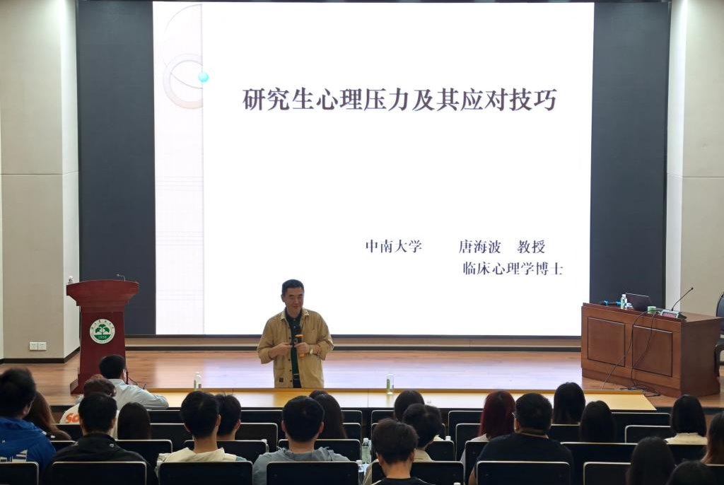 本次活动邀请了中南大学心理健康教育与咨询专家、临床心理学博士、中国心理学会临床与咨询心理学注册心理督导师唐海波教授作题为《研究生心理压力及其应对技巧》的主题报告。唐教授从压力的来源讲到压力的表现形式、压力的类型以及压力对人体的危害,并提出研究生应对压力的十种可行方式。唐教授与现场师生热情互动,深入浅出、旁征博引地通过案例引导研究生如何化解生活、学习中的压力,他还为现场师生普及了抑郁症的五大临床症状,从识别、干预、治疗三个方面对此类心理疾病进行了介绍。