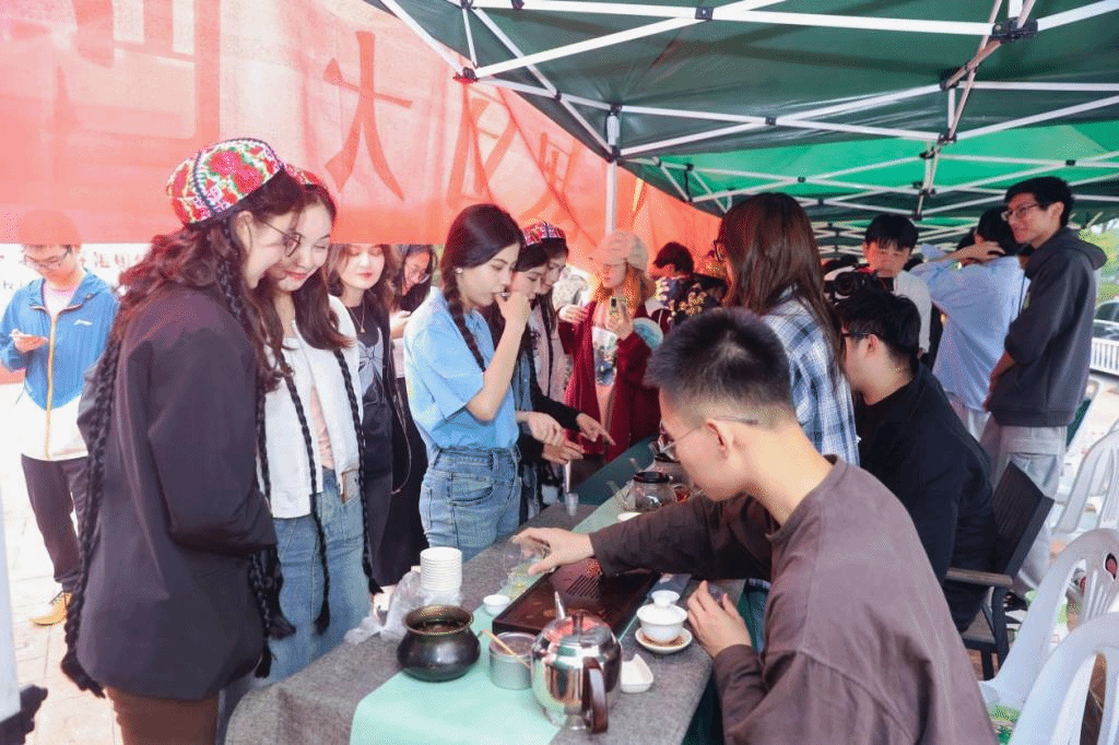 热闹非凡的“团团大巴扎”,展示多种充满民族风情的文创产品、服饰、特色乐器,吸引了大批浙农林大师生驻足体验。我校大学生“新长城”生态互助社、大学生竹木文创设计与制作协会、大学生昆虫爱好者协会、大学生雕版版印与篆刻协会和大学生茶文化协会的同学们也展示了具有学校特色的文创产品。活动现场,浙农林大学子与阿克苏青年共跳民族歌舞,掀起现场高潮,两地青年友谊在歌舞中愈加深厚。